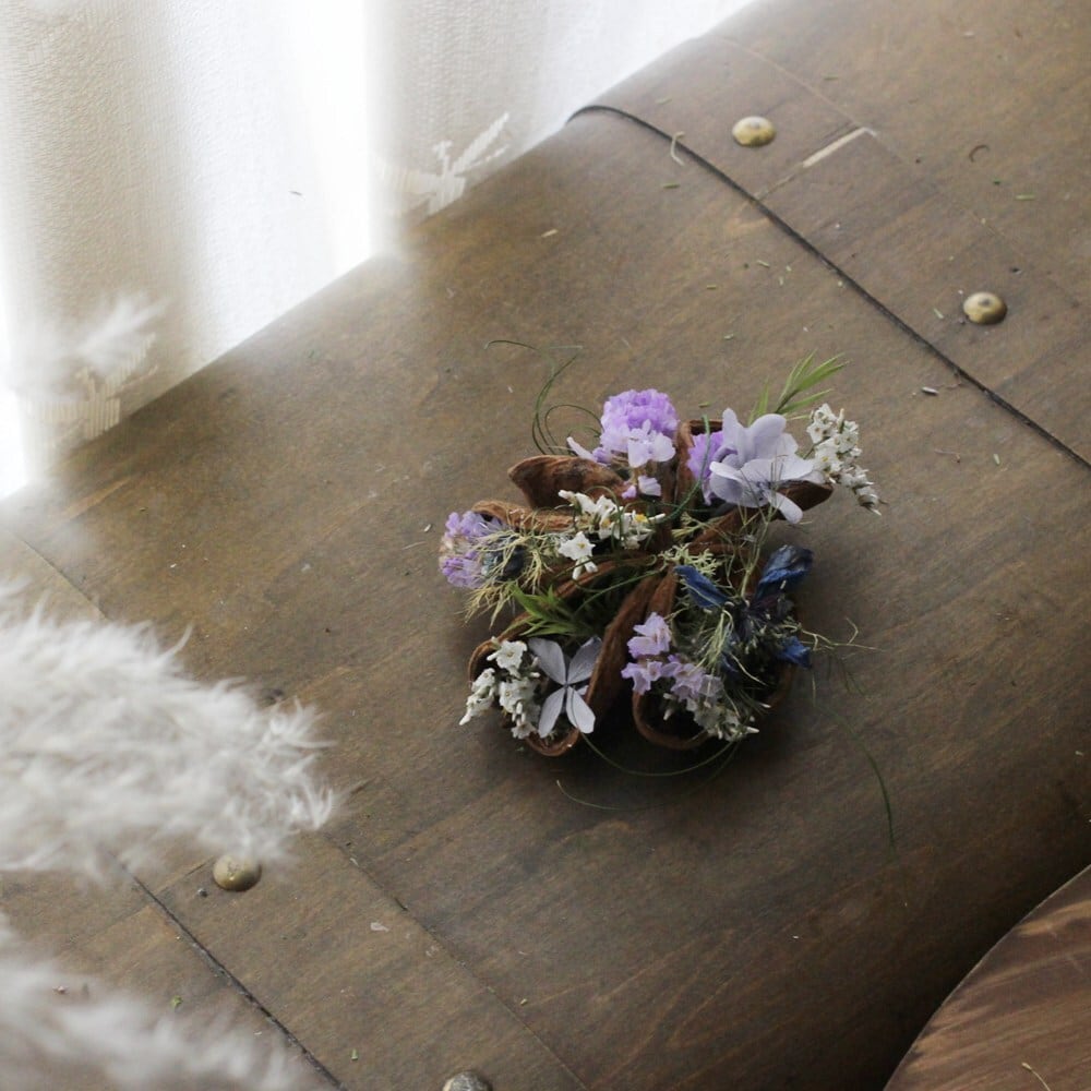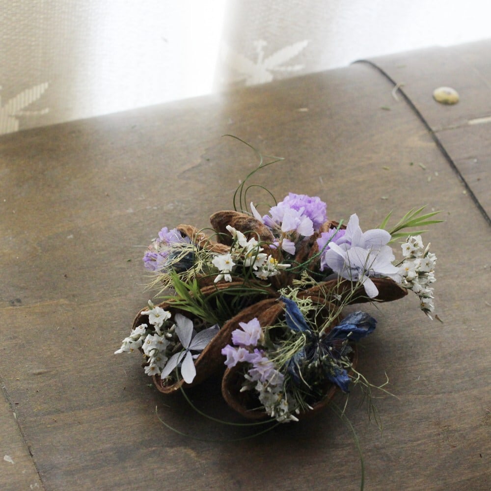 お花の形みたいな木の実のロータスフラワーに、ドライフラワーなどを入れて、ナチュラルにかわいくデザインしました♪