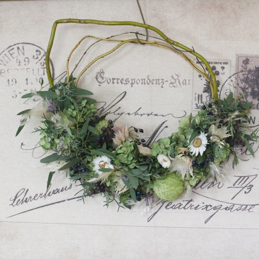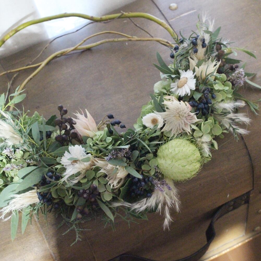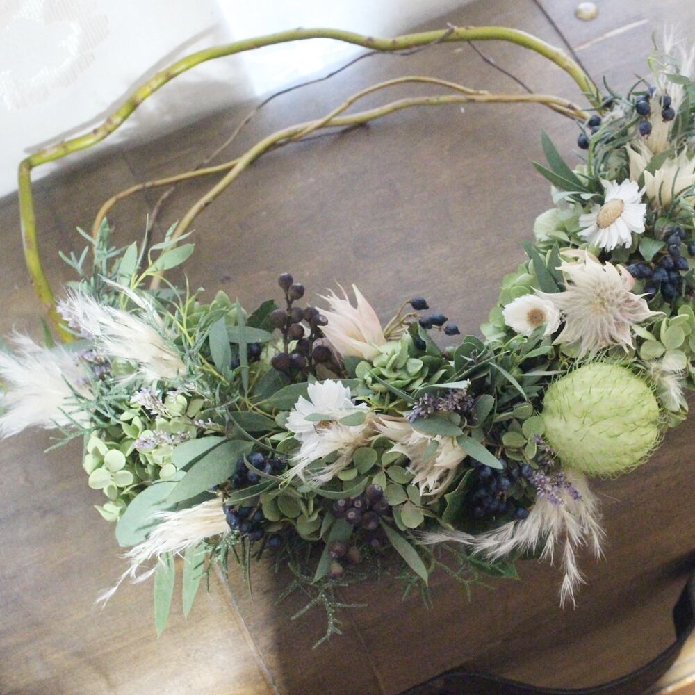 ナチュラルな雲竜柳でリースベースを作り、ユーカリやアジサイ、セルリア、フウセントウワタ、パンパスグラスなどで飾り付けました。