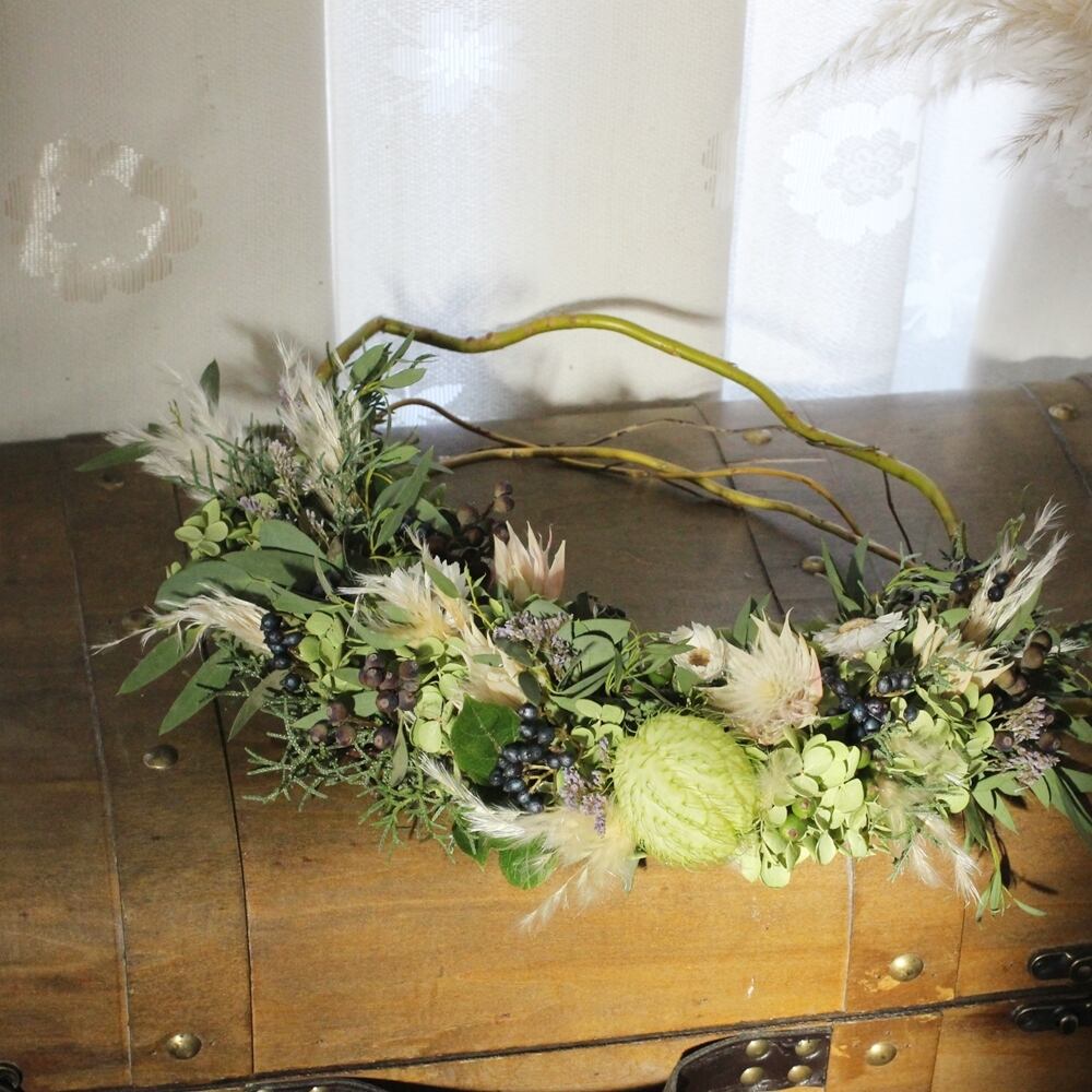 ◆花材:雲竜柳・ユーカリ・パンパスグラス・アジサイ・セルリア・フウセントウワタ・ビバーナムティナス・HBスターチス・ローダンセ(ドライフラワー)