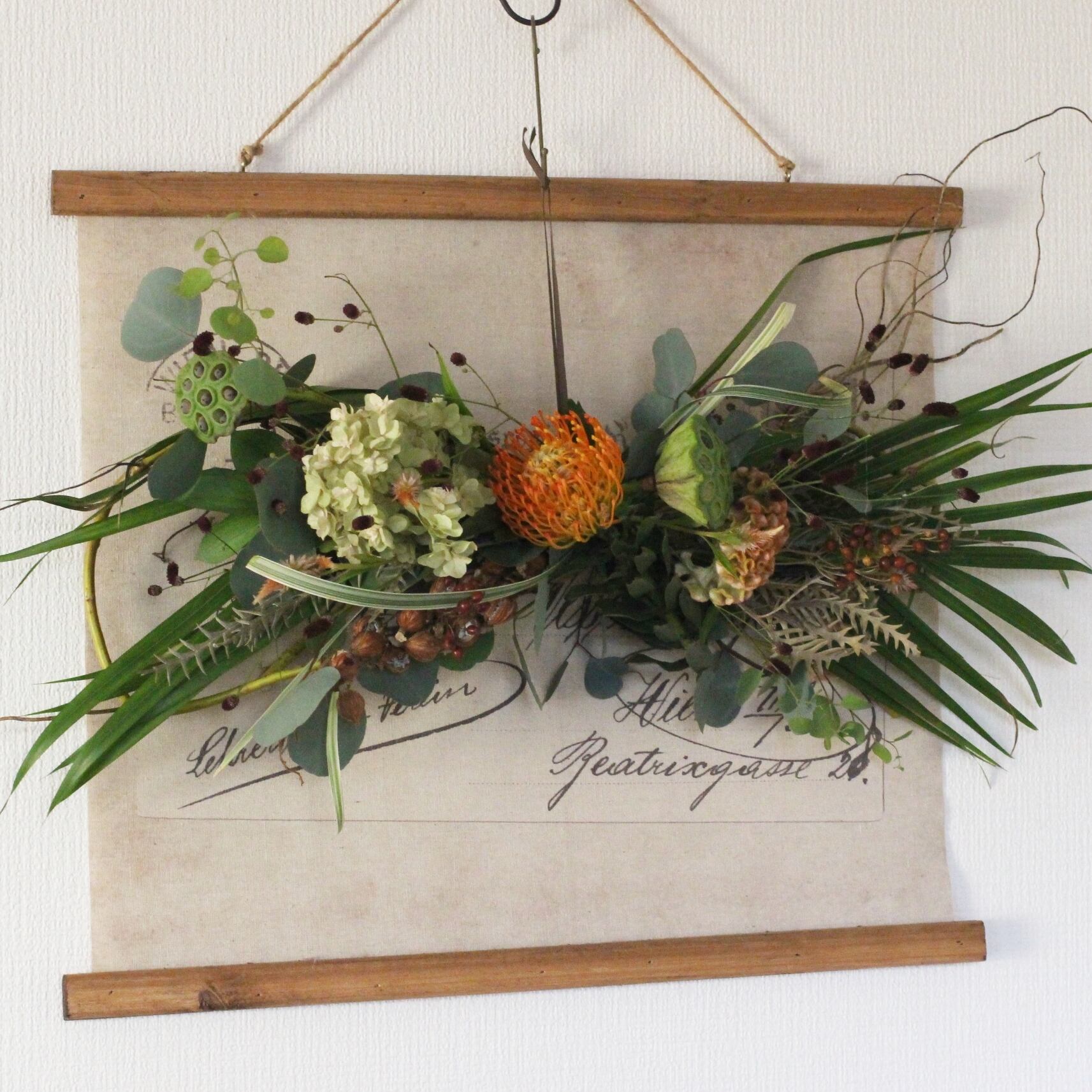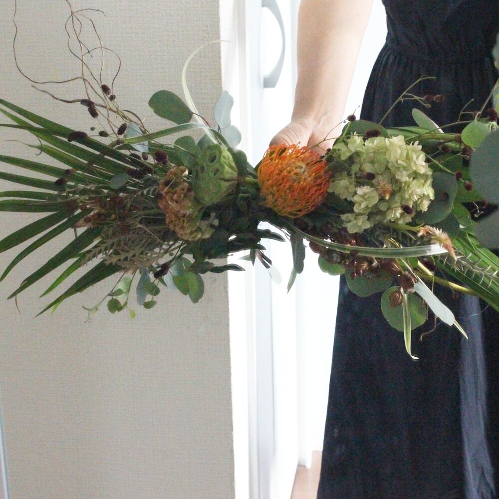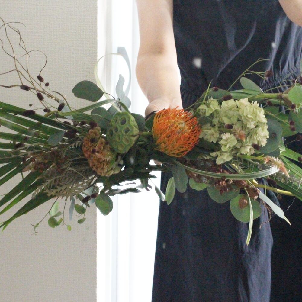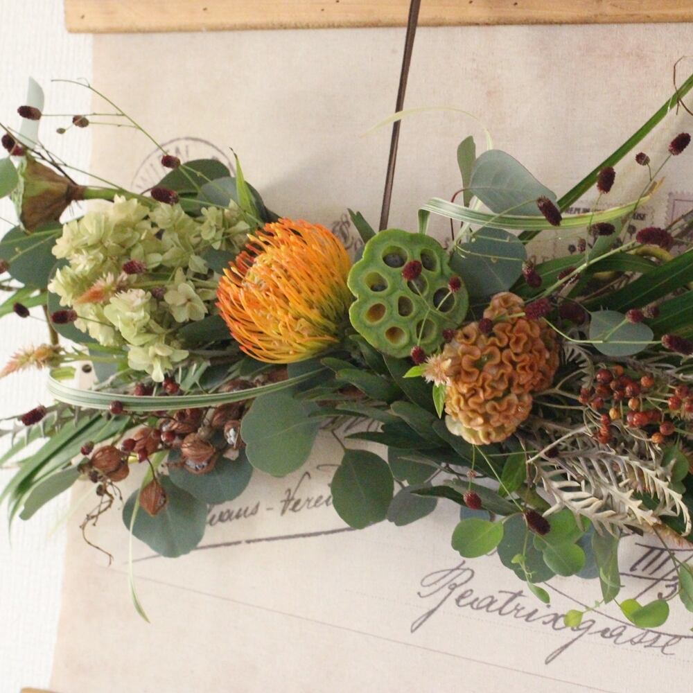 ◆花材:雲竜柳・ユーカリ・アレカヤシ・ピンクッション・ワレモコウ・アジサイ・野ばらの実・ケイトウ・ハスの実・セロシア(ドライフラワー)