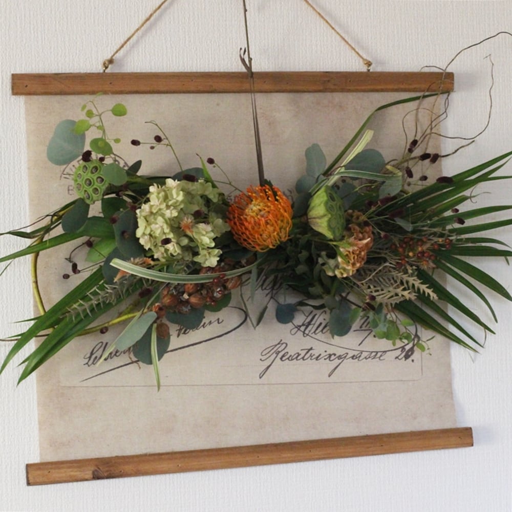 ドライになるフレッシュフラワーや秋のドライフラワーで制作しました。