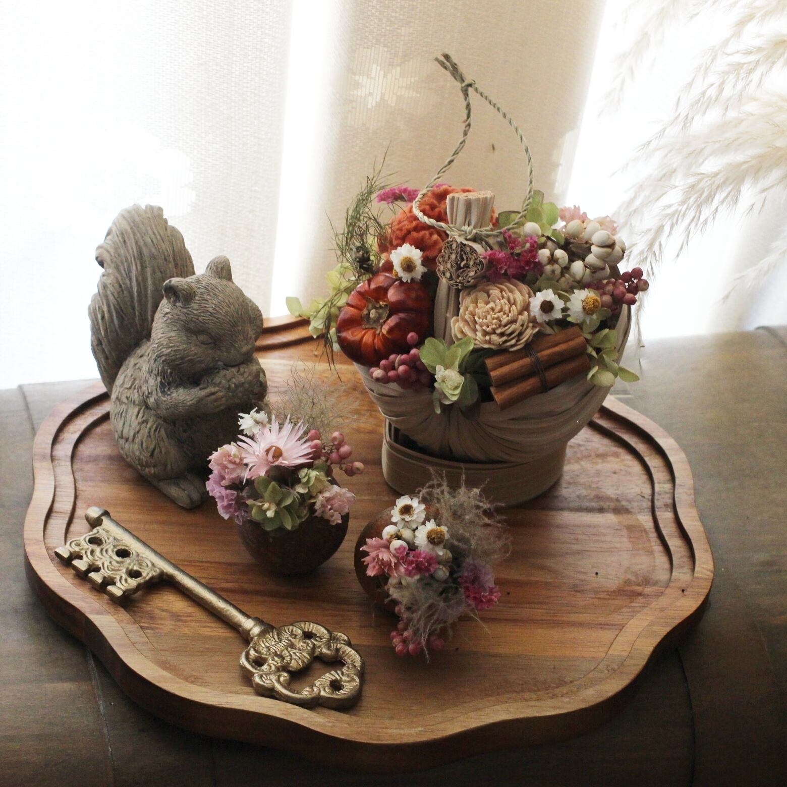 クルチフルーツの木の実に、ドライフラワーを入れて、ナチュラルにデザインしました♪