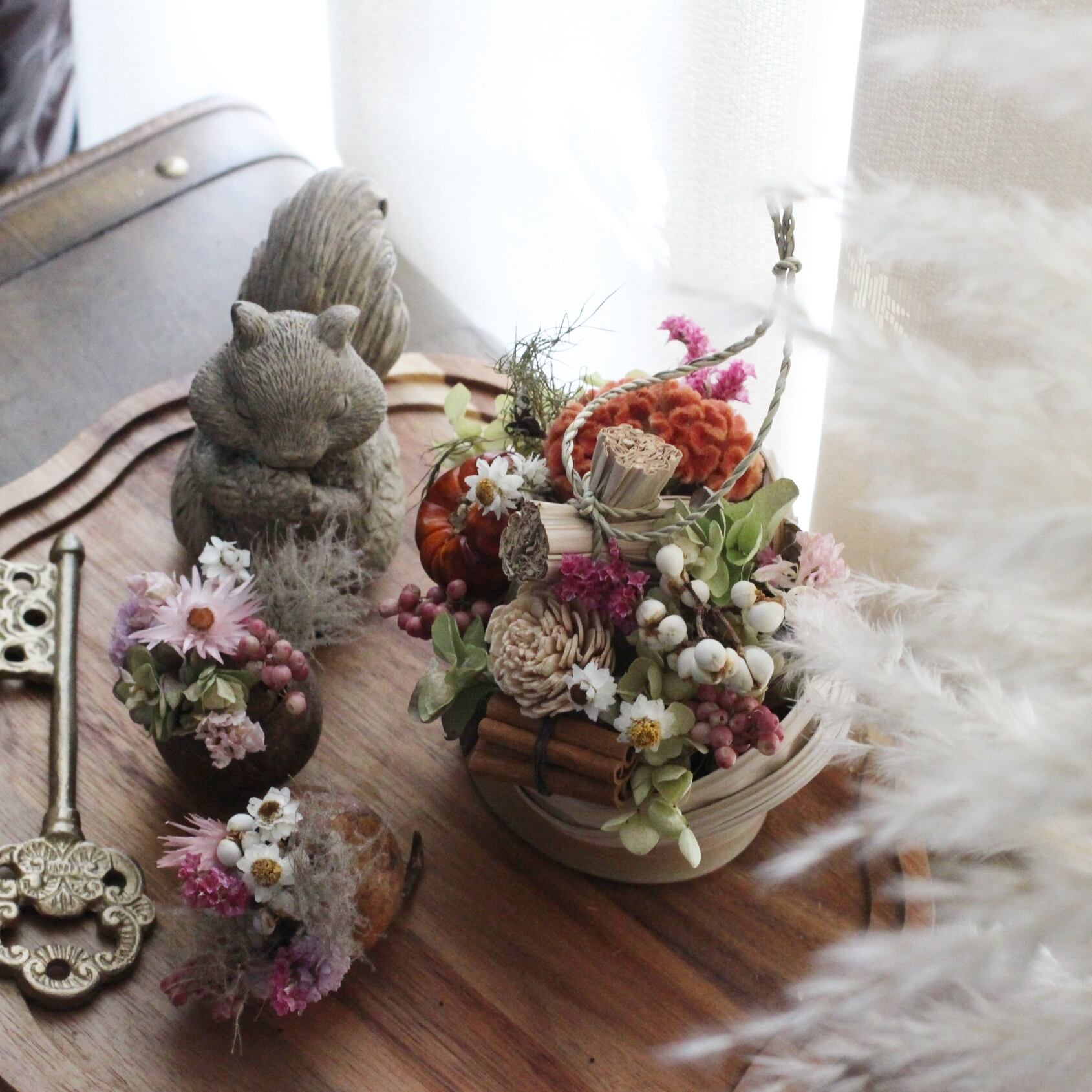 ◆花材:スターチス・スモークツリー・ローダンセ。ペッパーベリー・アジサイなど(ドライフラワー)