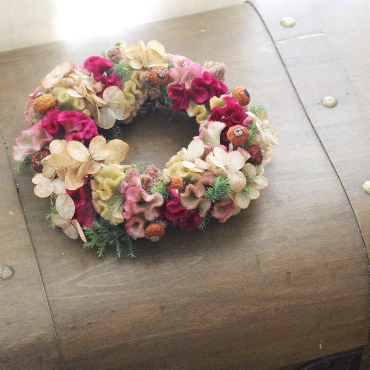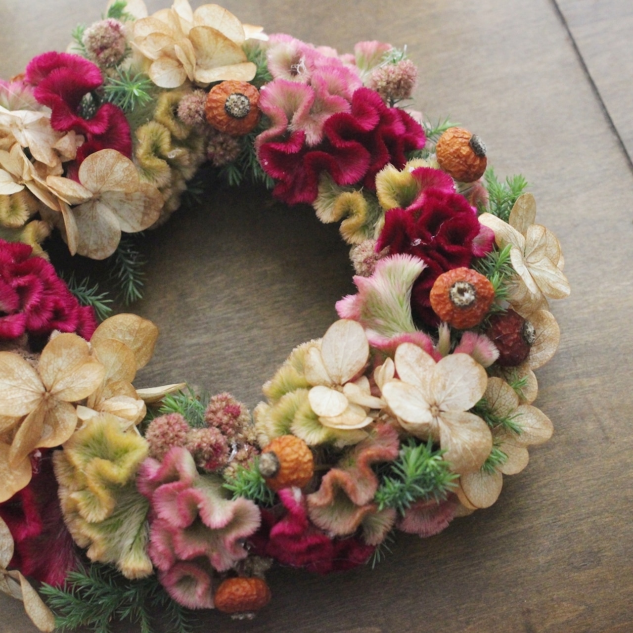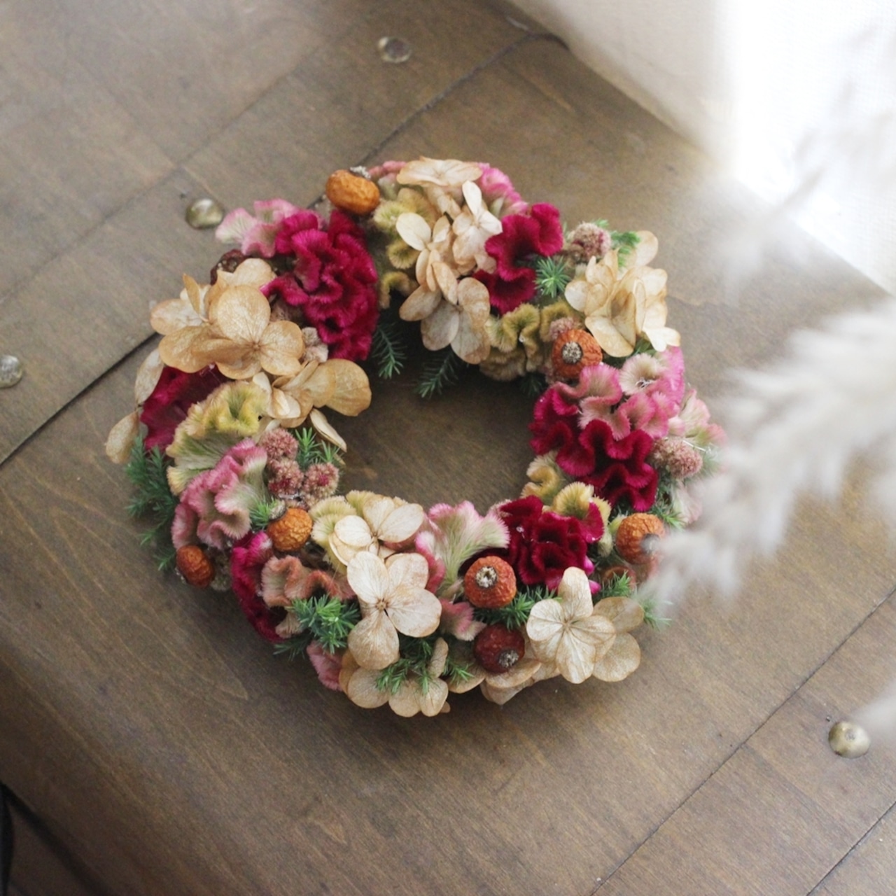 ドライフラワーで作るリースは、1つ1つ違った雰囲気でお楽しみいただけます。