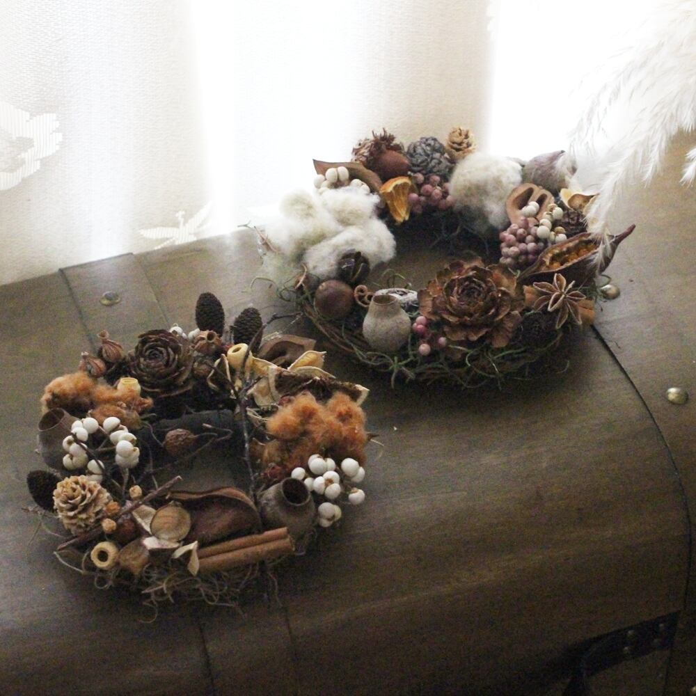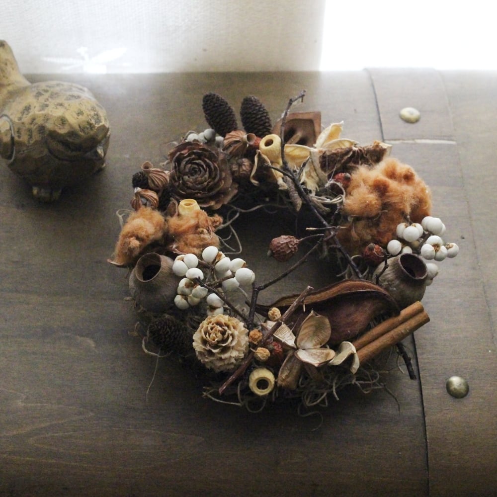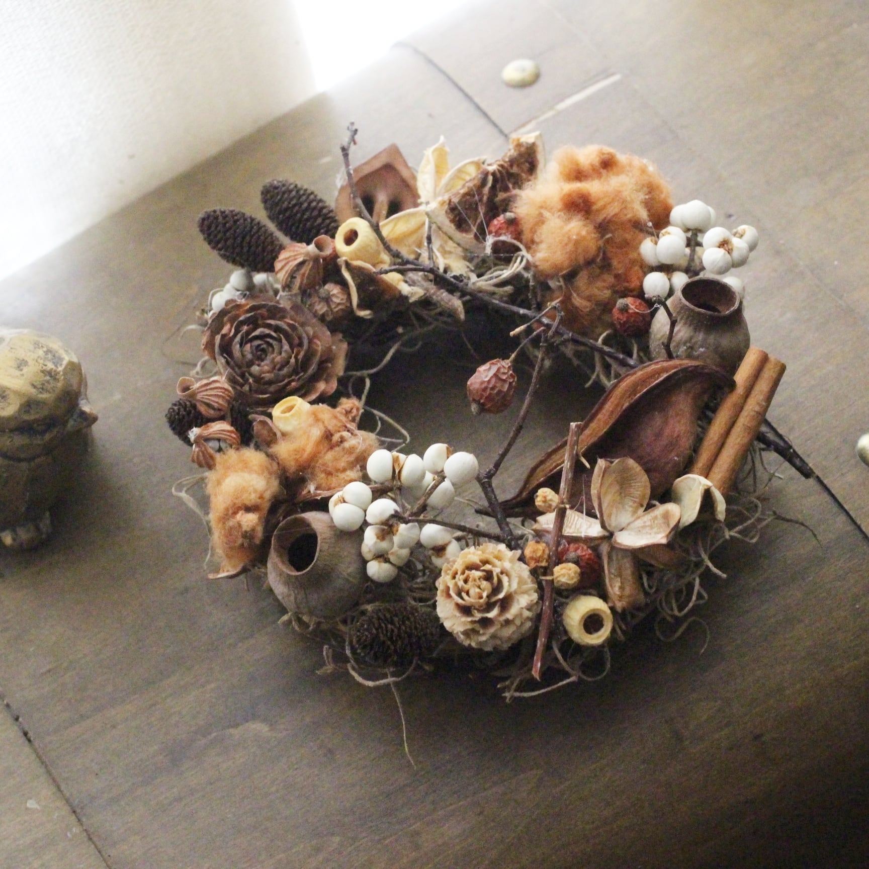 コットンや数種の木の実、ドライフルーツなどで秋にぴったりなリースを作成しました。