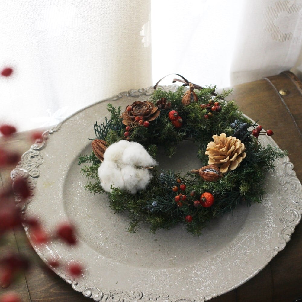 ■花材:木の実数種類・コットン(ドライフラワー)スギ・マウンテンジュニパー(プリザーブドフラワー)
