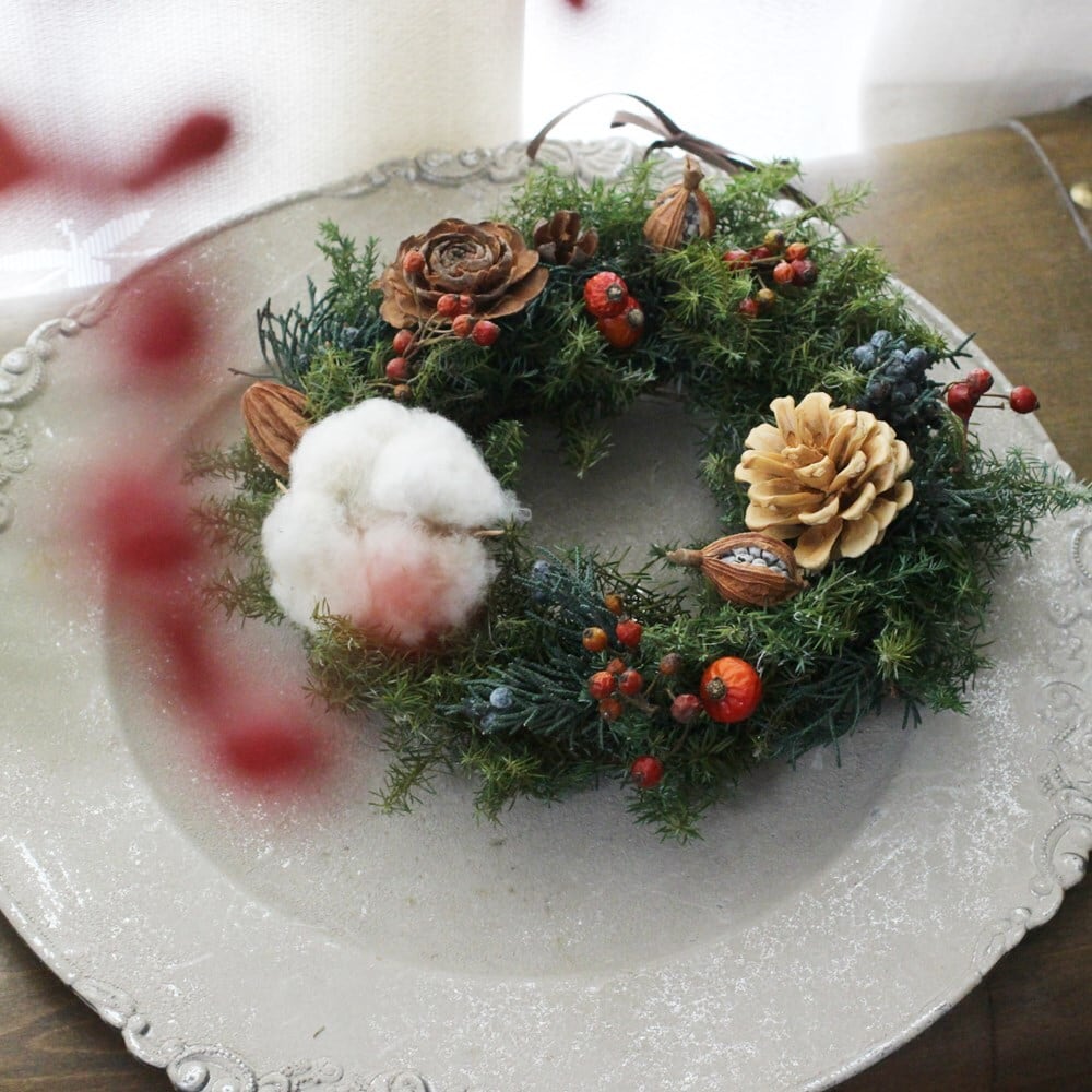 コットンや実もの、数種の木の実で作った、秋冬の季節にぴったりなリースを作成しました。