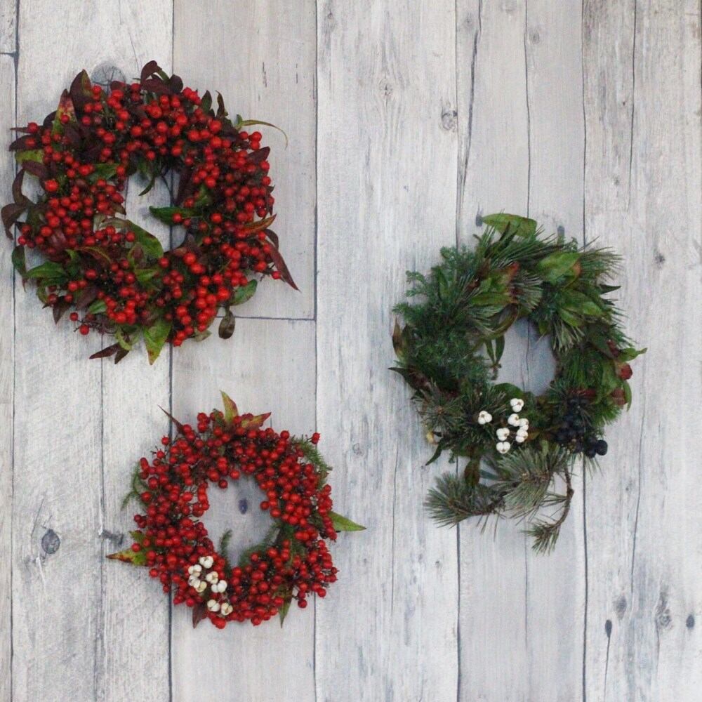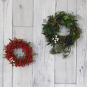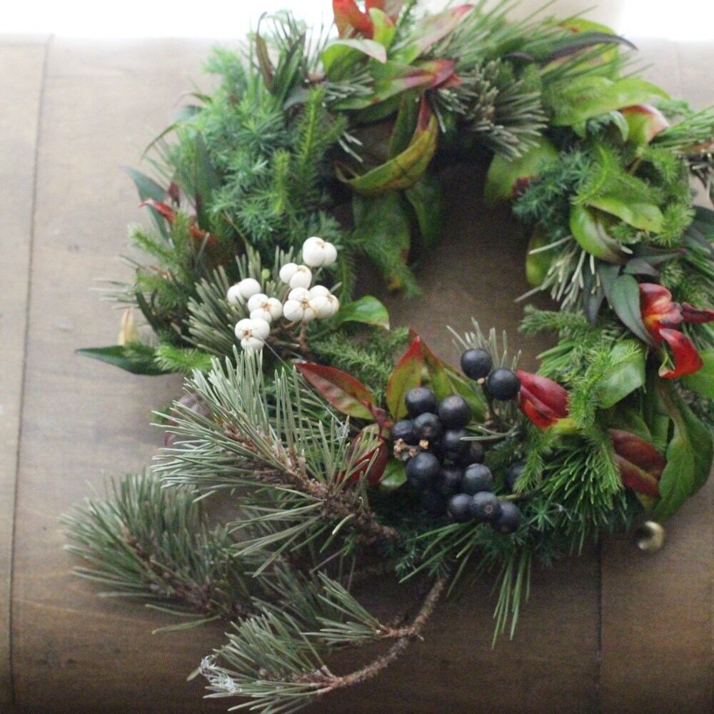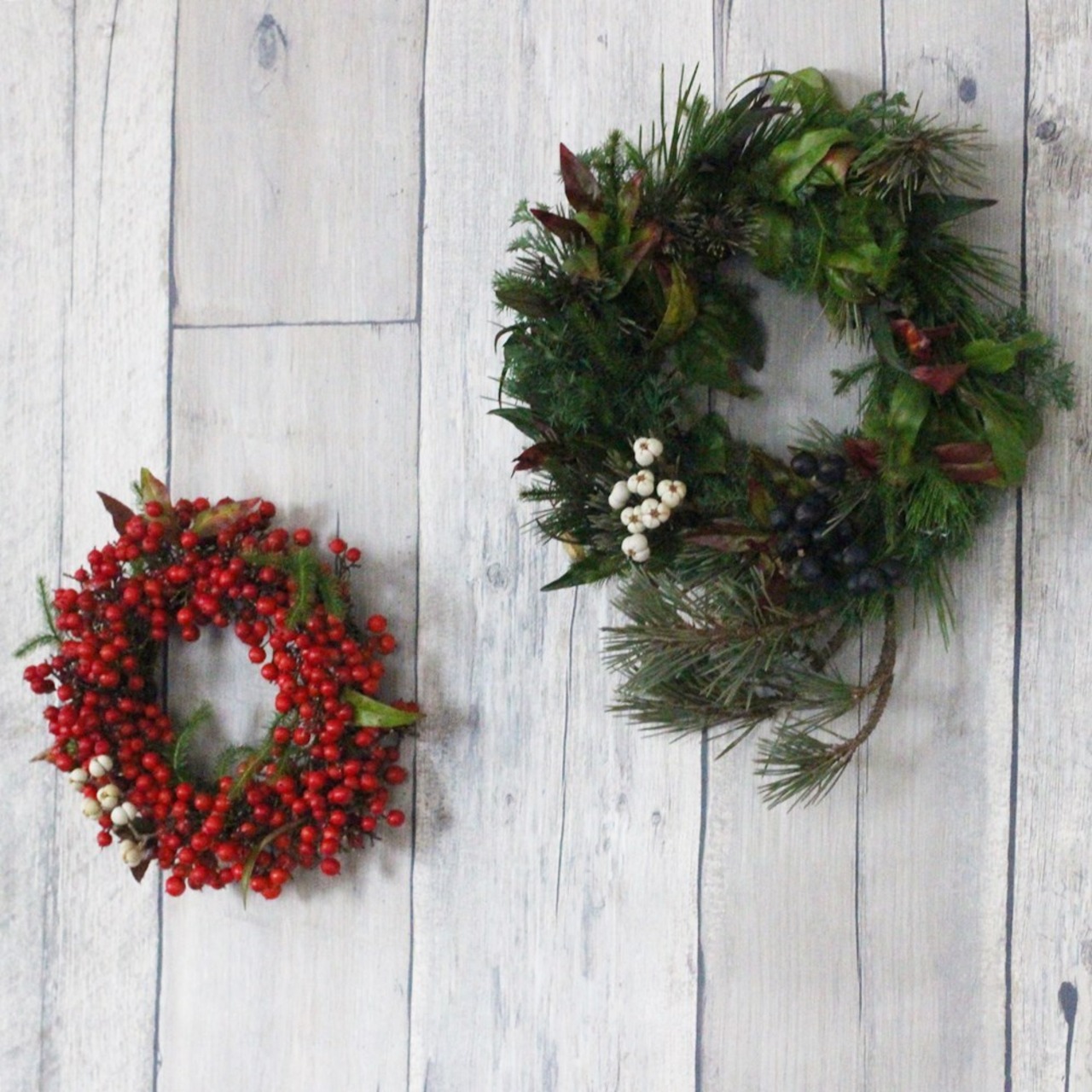 こちらはフレッシュグリーンの松をメインに、オタフクナンテンやヒカゲカズラ、実ものたちで飾り付けました。