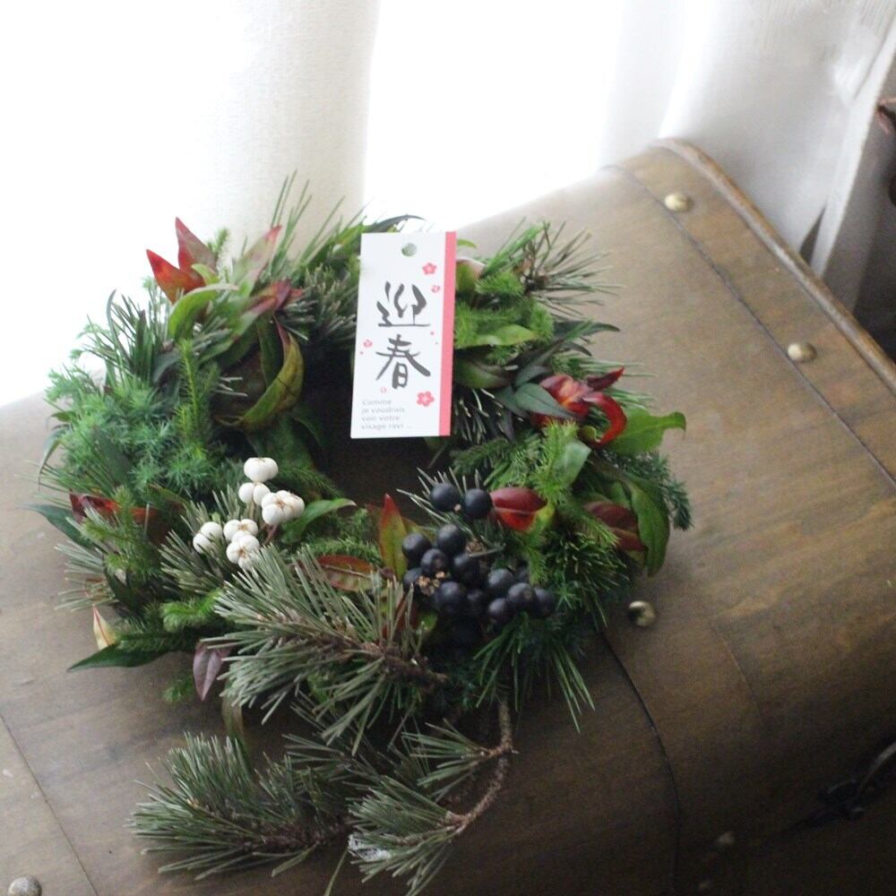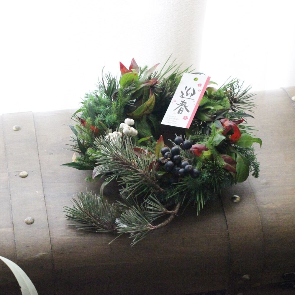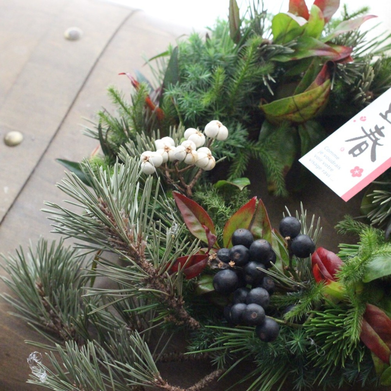 ■花材:松・オタフクナンテン・ヒカゲカズラ・スギ(フレッシュフラワー) シャリンバイの実・ナンキンハゼ(ドライフラワー)