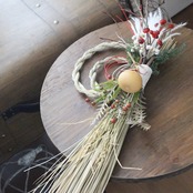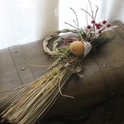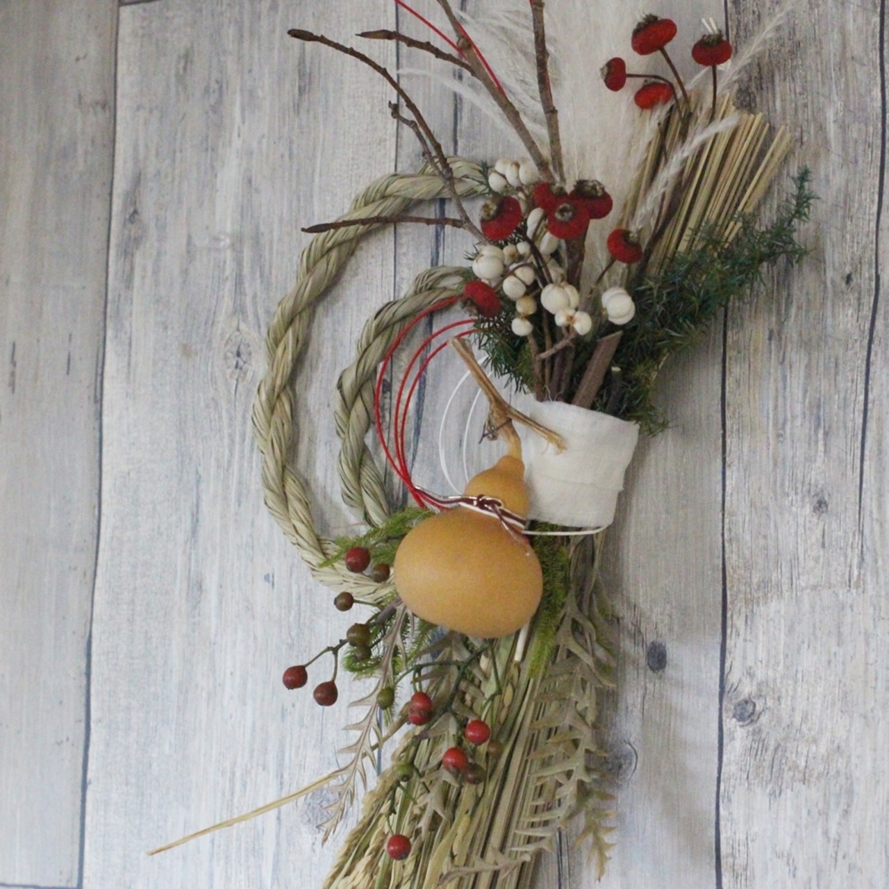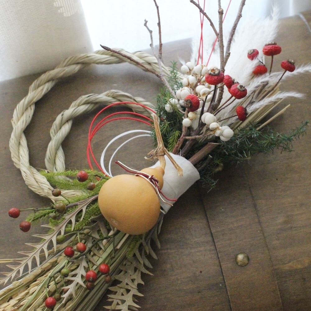 ススキやバラの実、ナンキンハゼ、ひょうたんなどで飾り付けたナチュラル&シンプルなしめ縄です。
