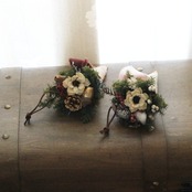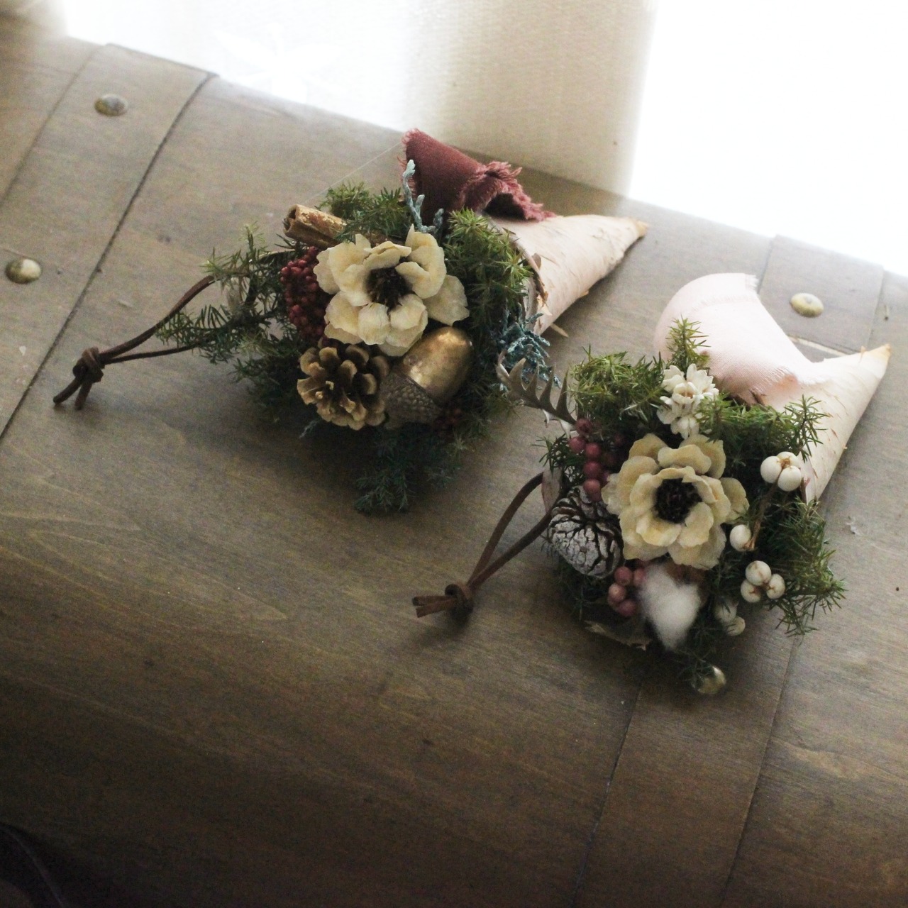 白樺のカップに、秋冬にかわいいお花たちを詰め込みました。