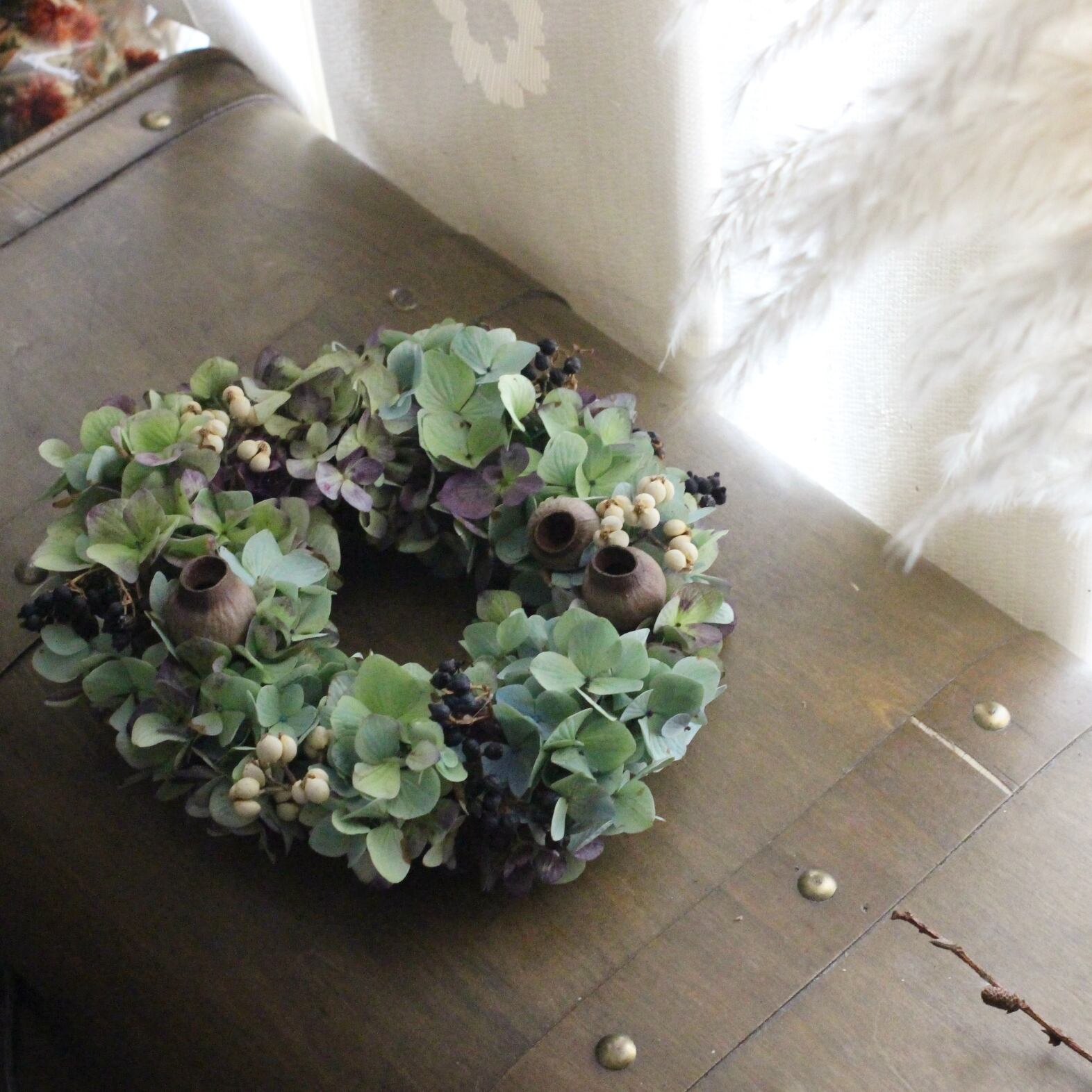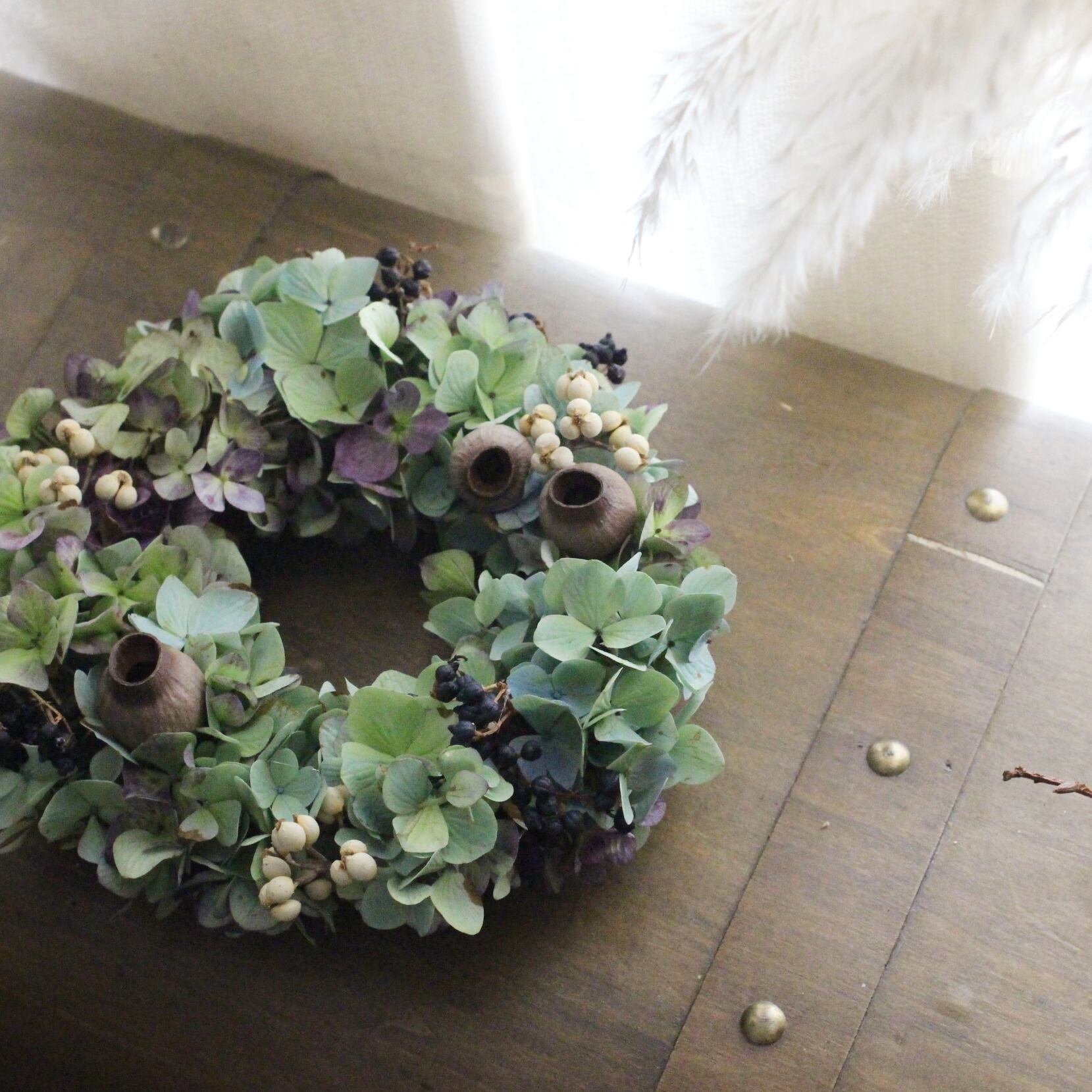 ◆花材:秋色アジサイ・ユーカリの実・ナンキンハゼ・ビバーナムティナス(ドライフラワー)