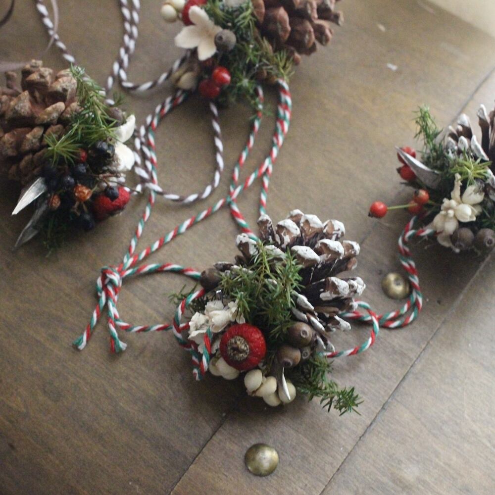 松かさにスギや木の実などを付けた、クリスマスにぴったりなアイテム。