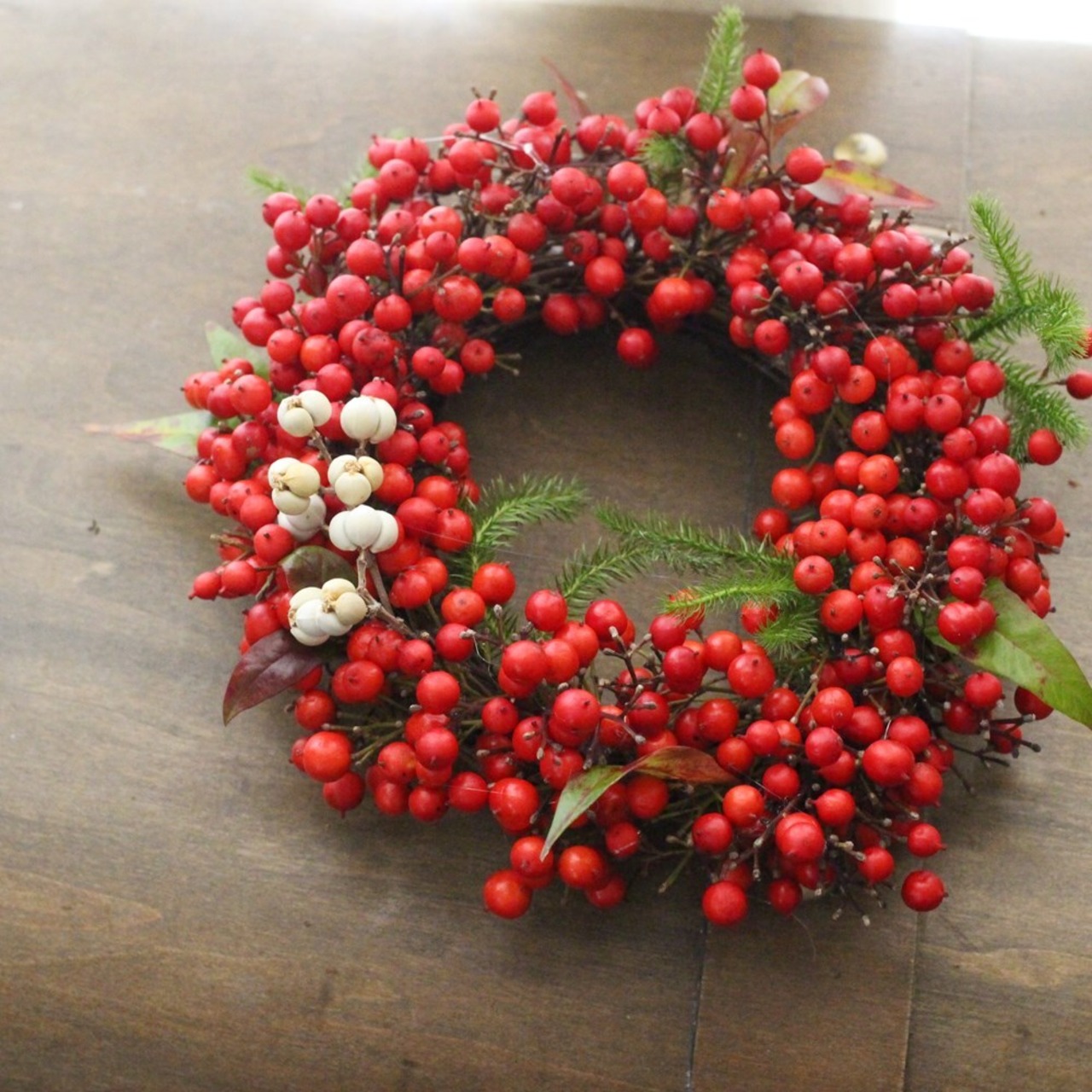 こちらはフレッシュの南天の実をメインに、ナンキンハゼの紅白な色合いで飾り付けました。