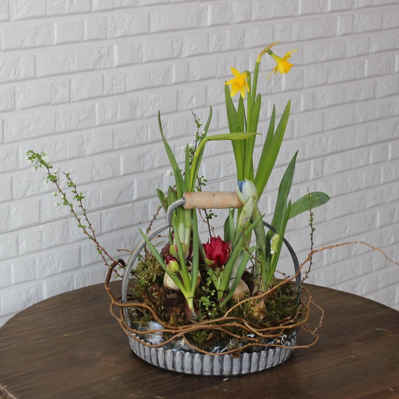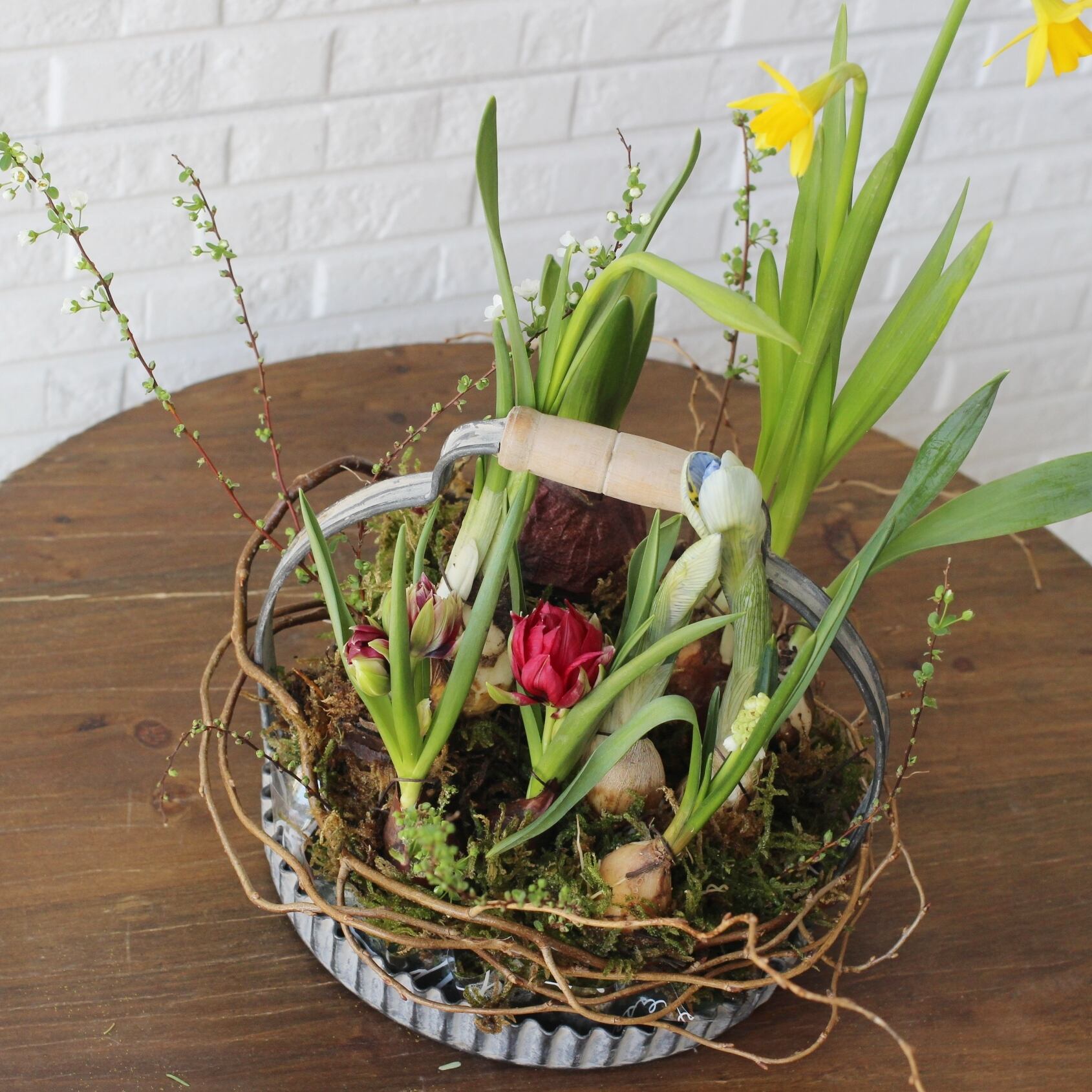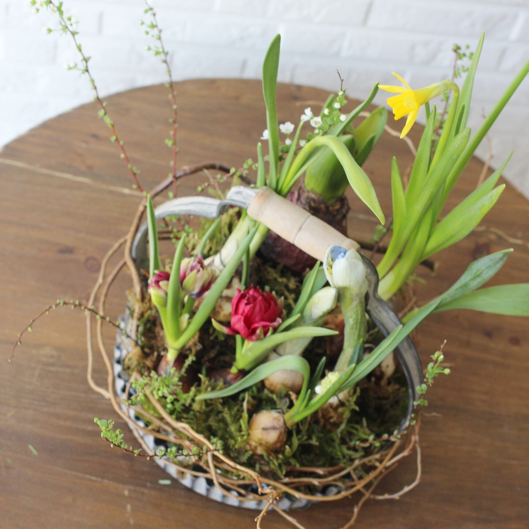 数種類の球根をアレンジし、ヤナギなどのツルで飾り付けております。