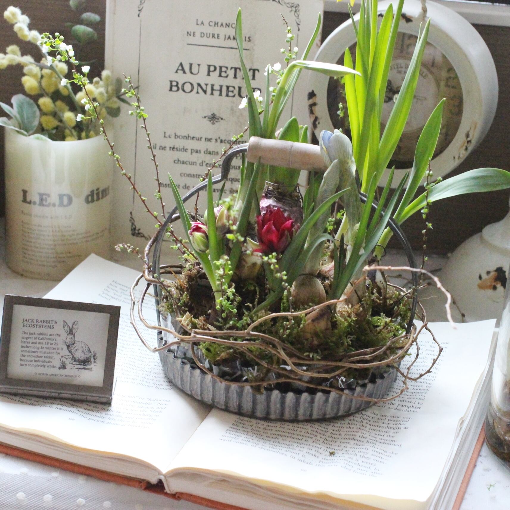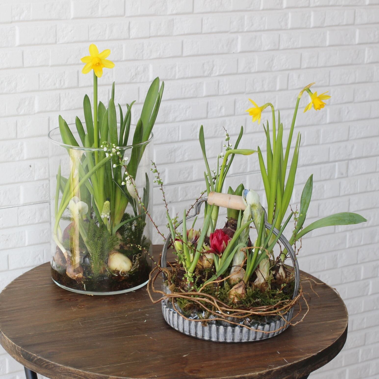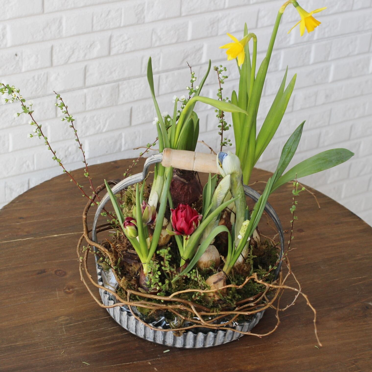 数種類の球根をアレンジし、ヤナギなどのツルで飾り付けております。