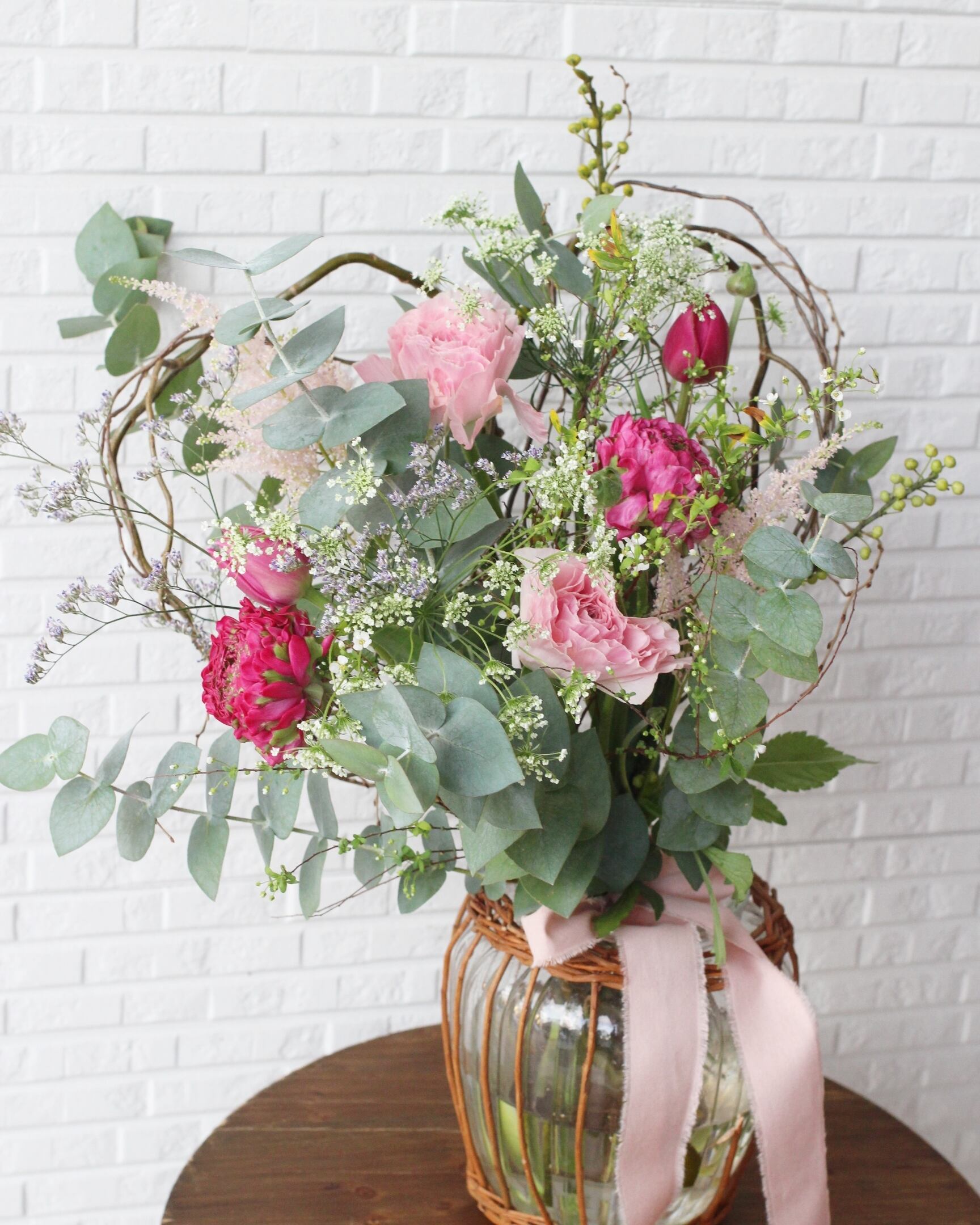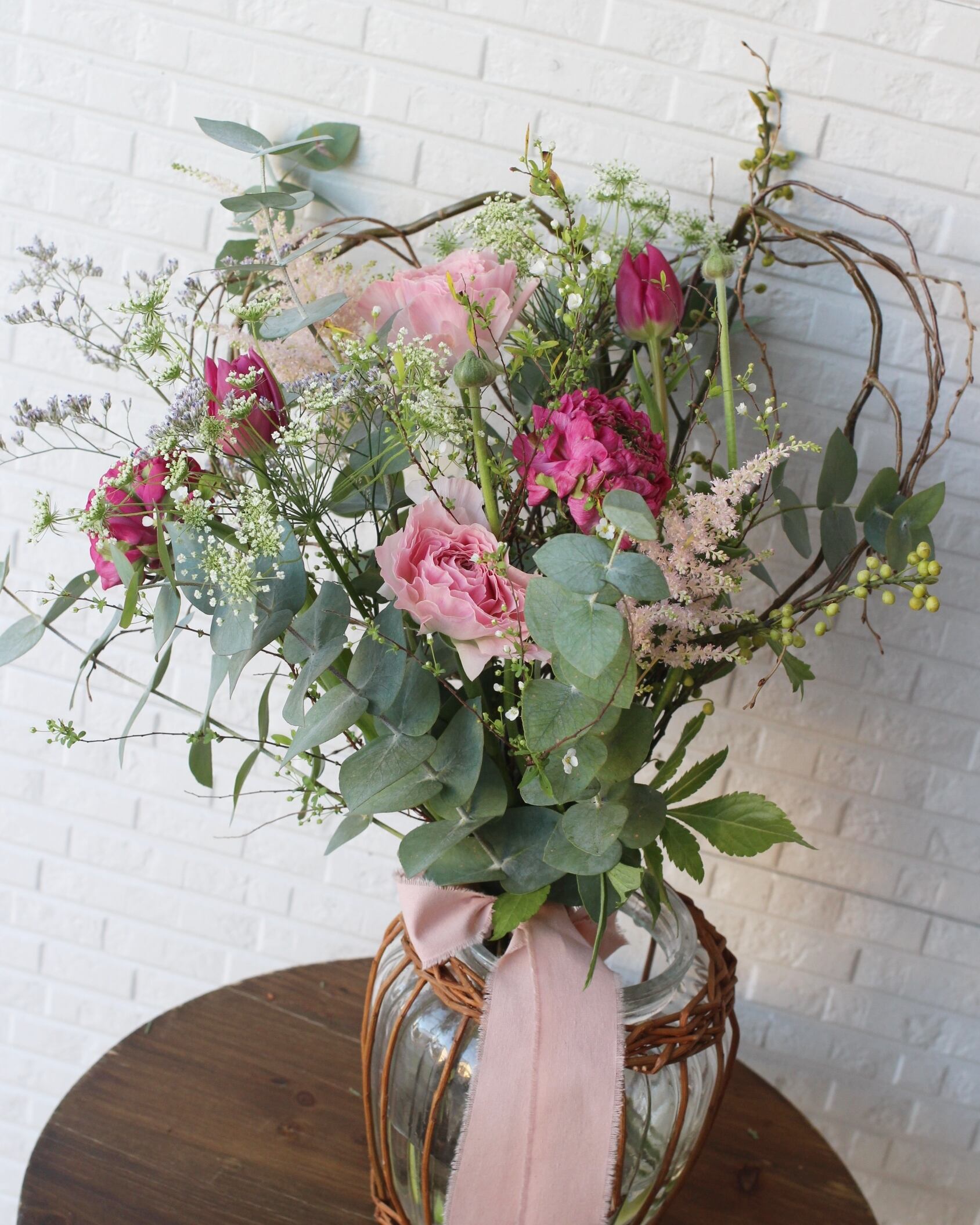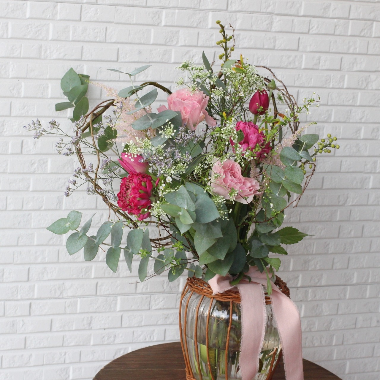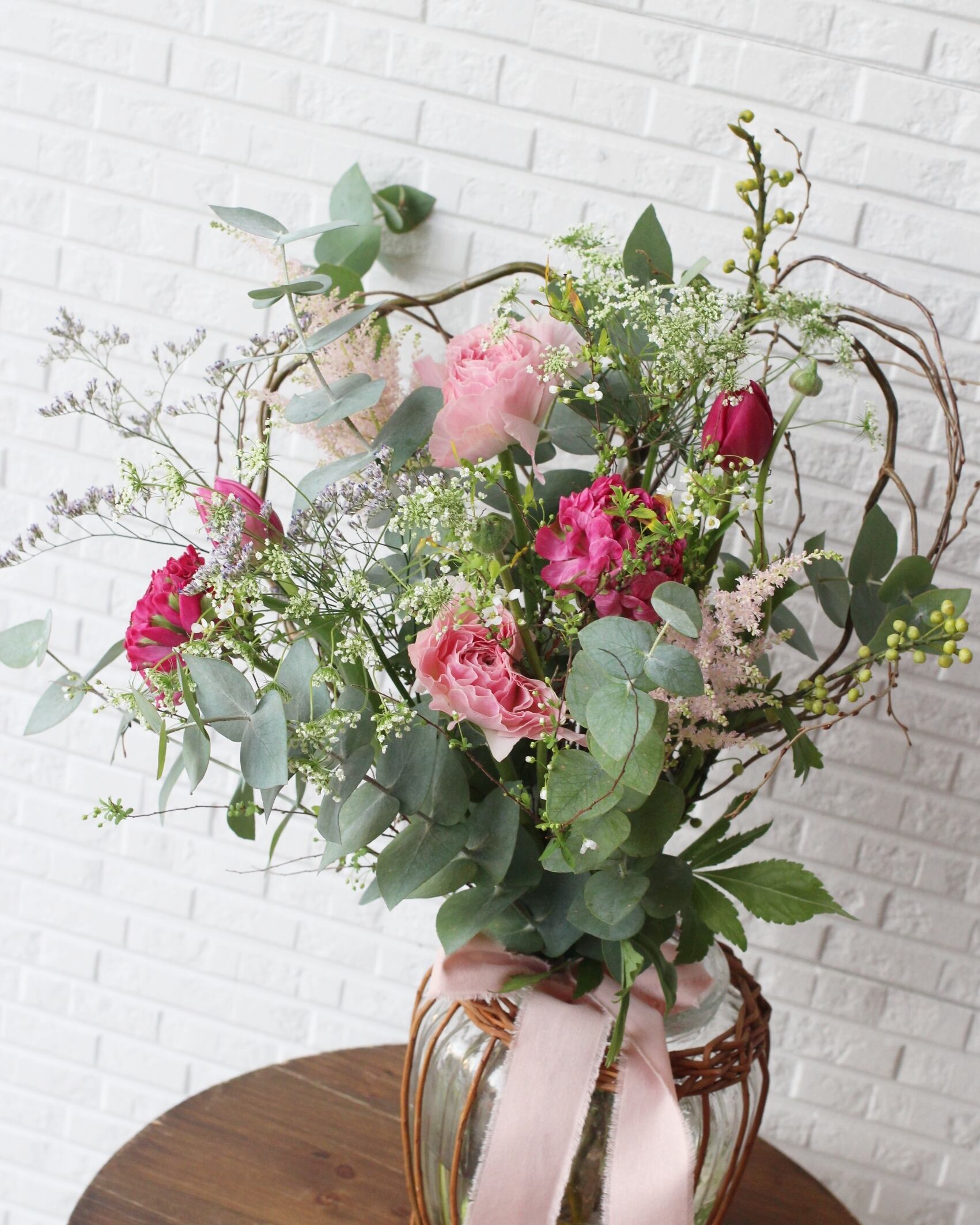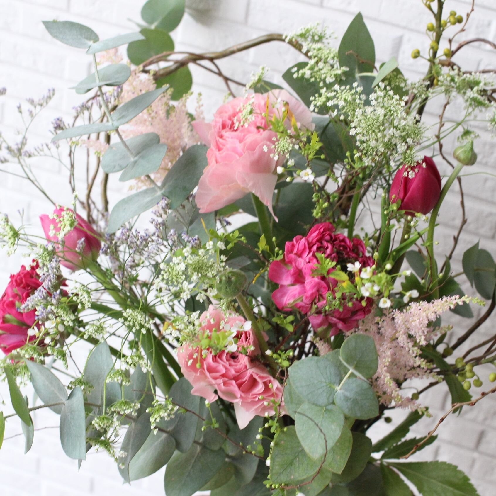 雲竜などの枝ものでハート型を作り、ピンクのお花たちで彩りをつけました。