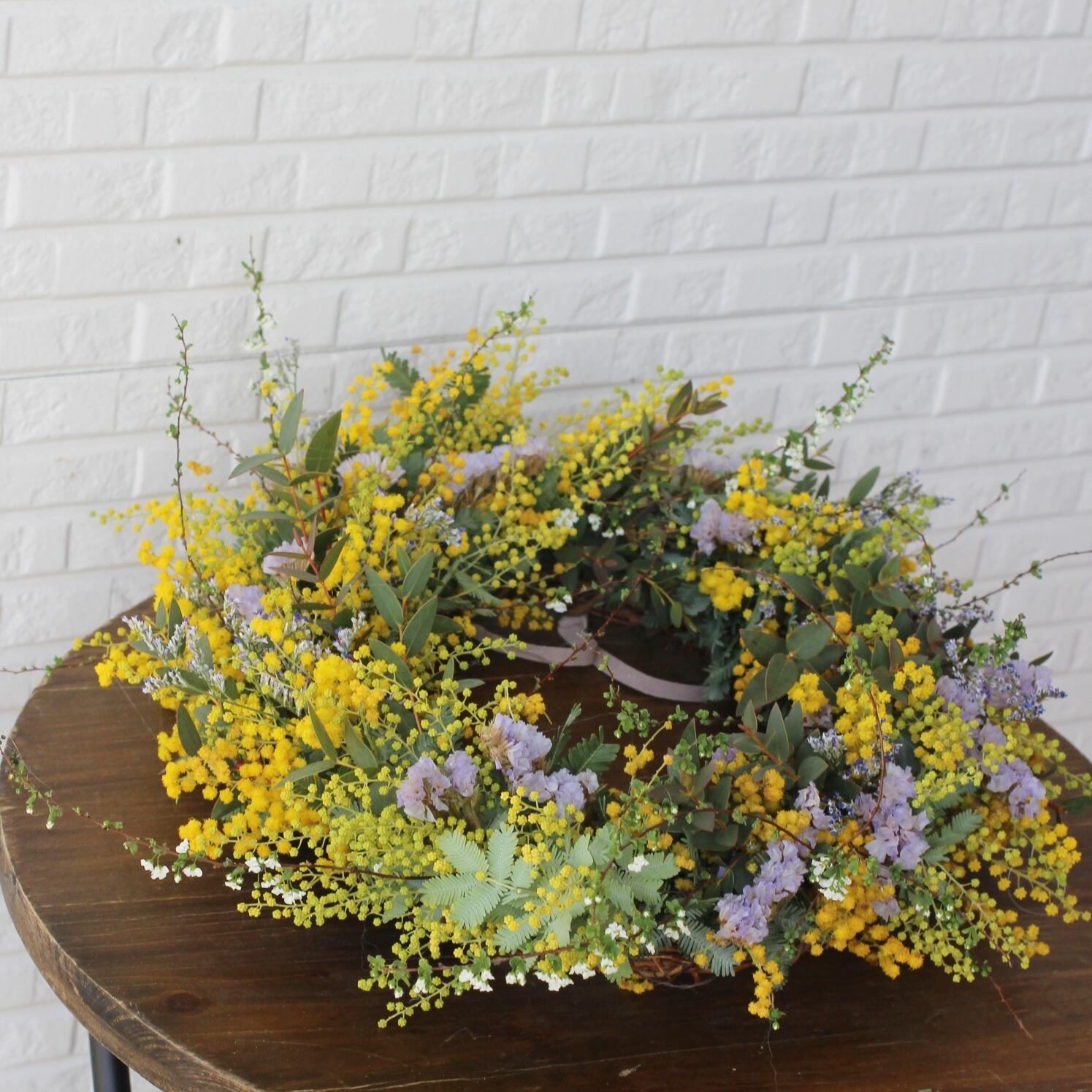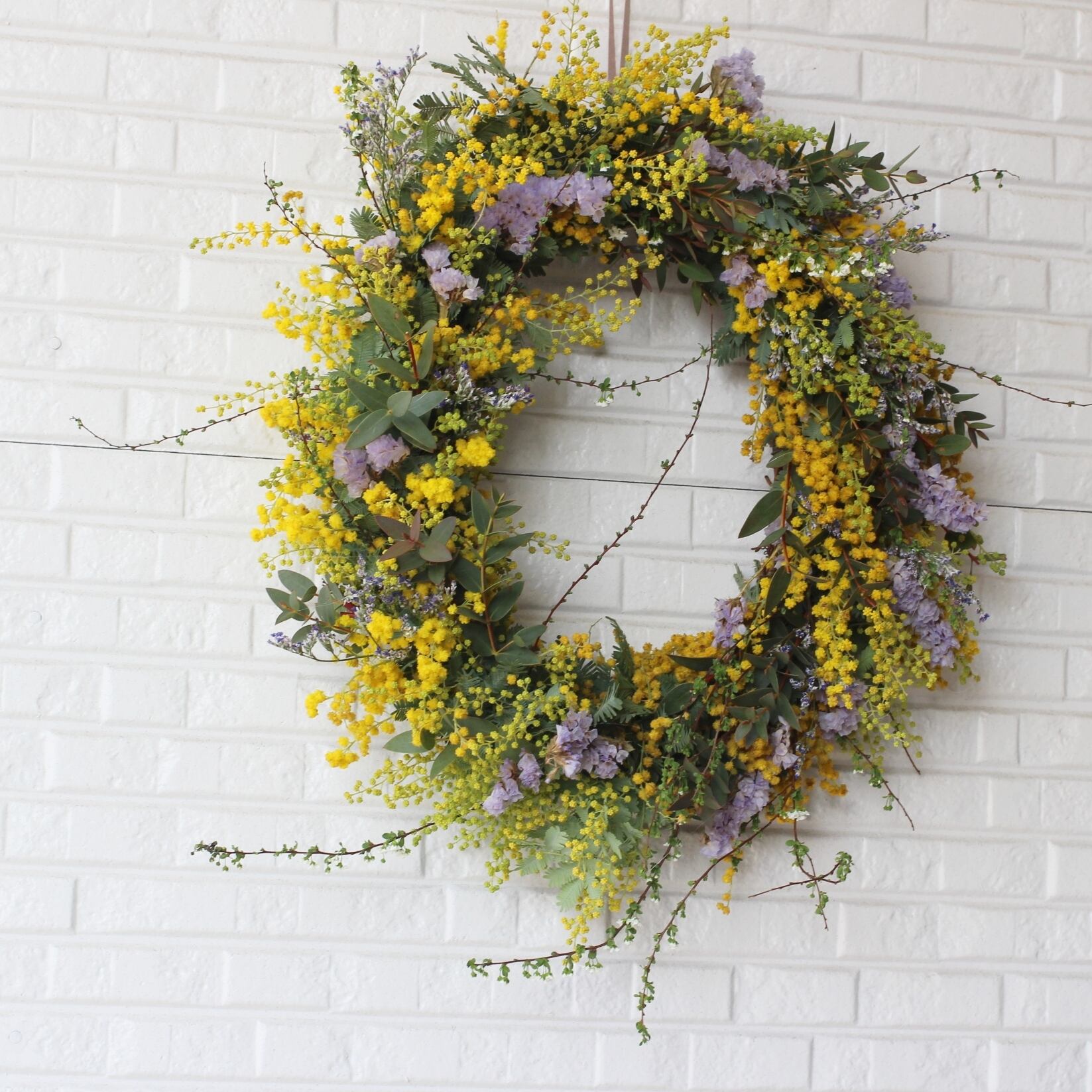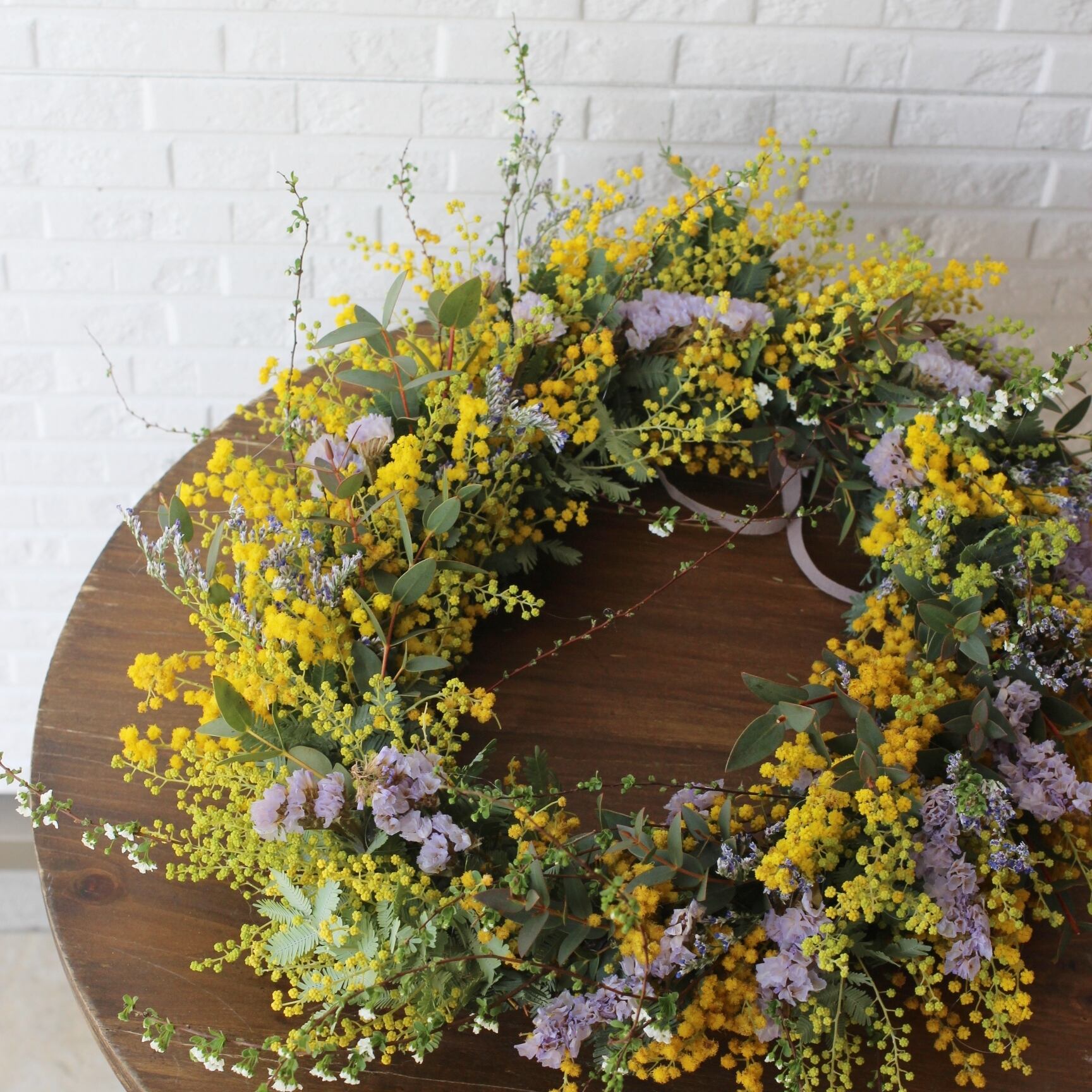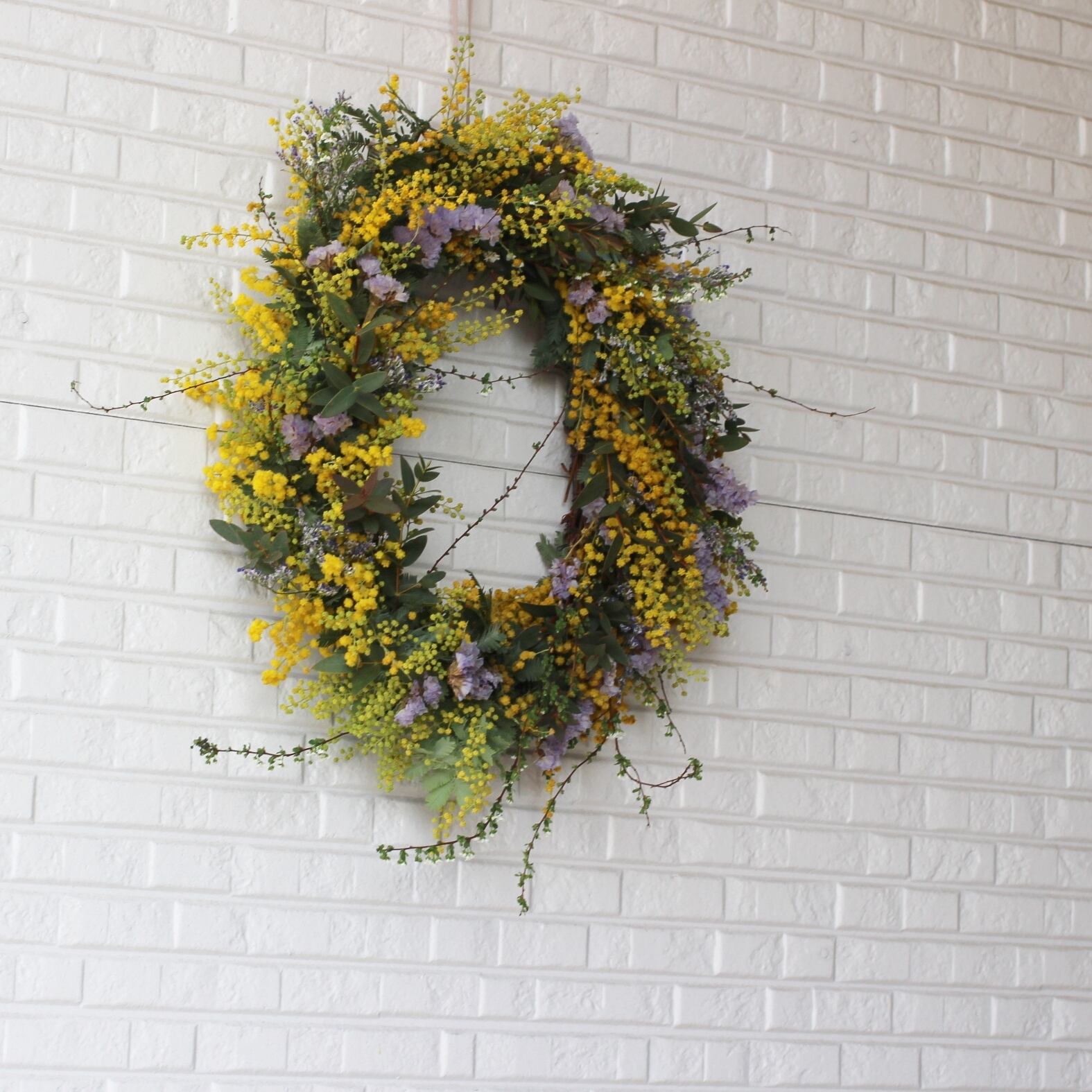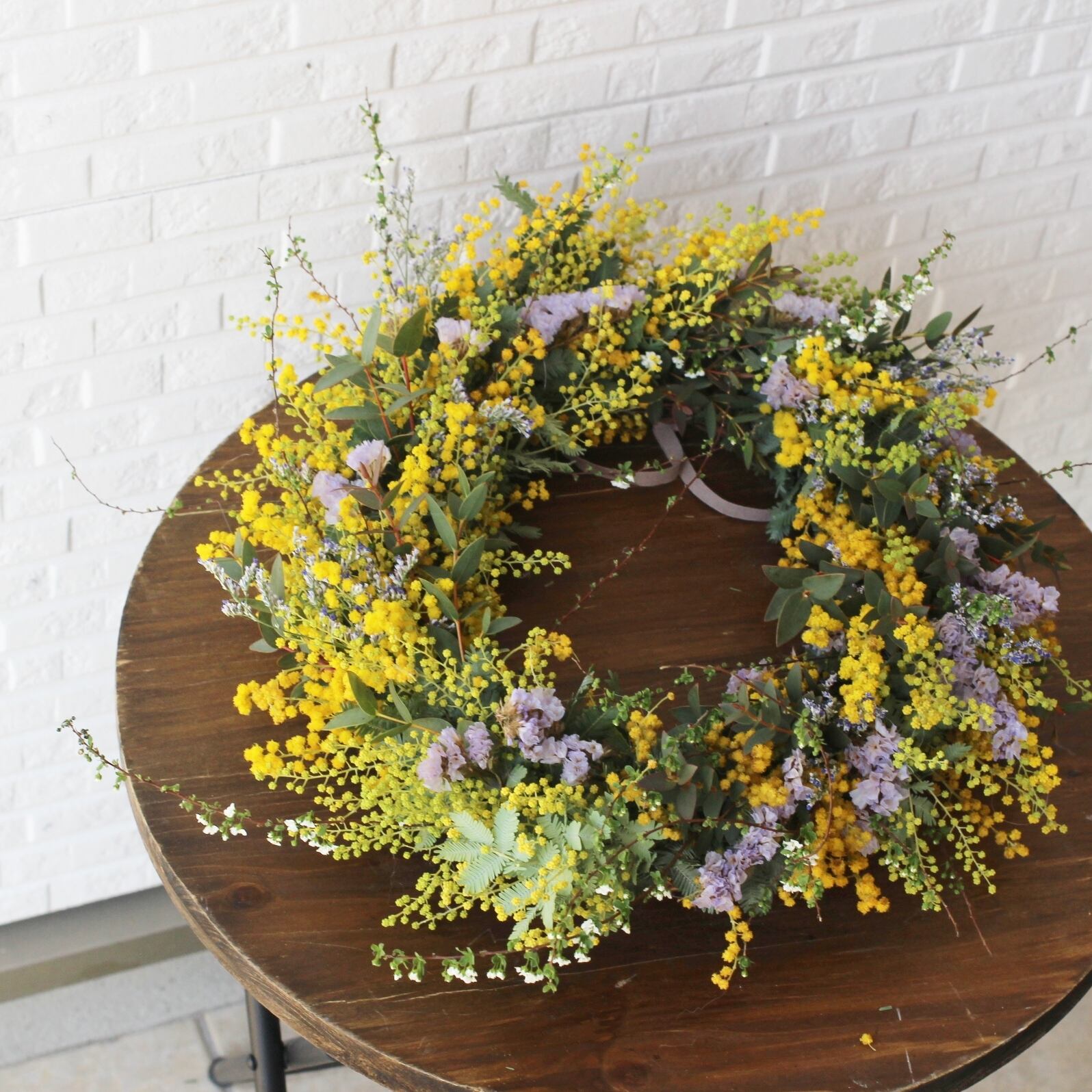 ◆花材:ミモザ・ユーカリ・アカシア・雪柳・スターチス(ドライフラワー)