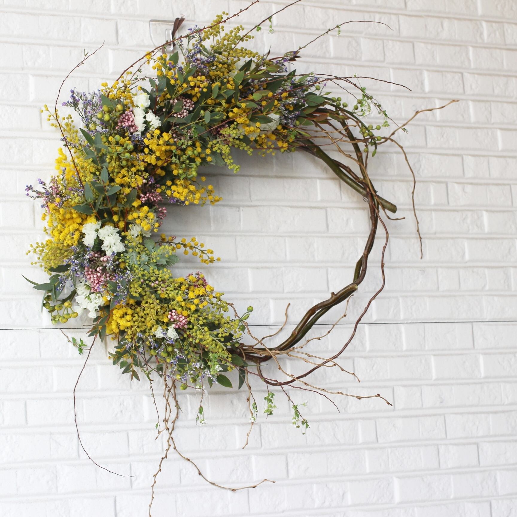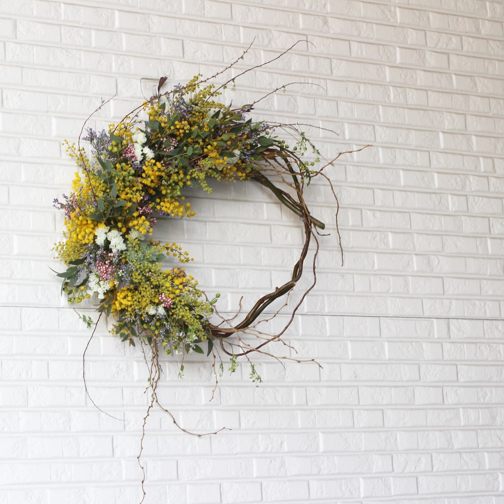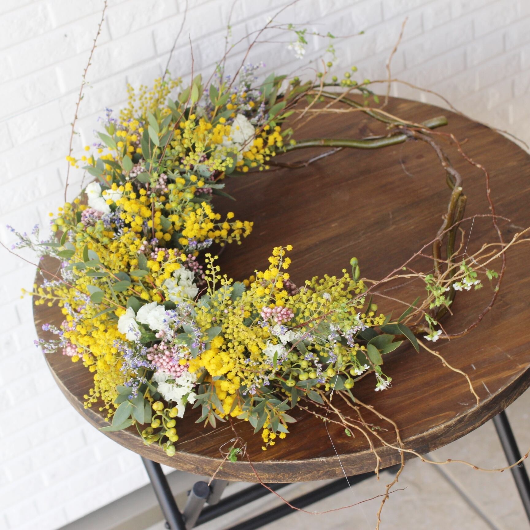 ◆花材:ミモザ・ユーカリ・アカシア・雪柳・スターチス・ライスフラワー・雲竜柳(ドライフラワー)