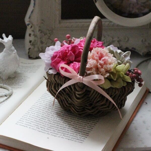 小さめのバスケットに、野バラやカーネーションなどでアレンジしました。