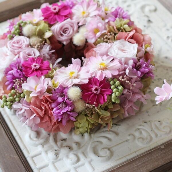◆花材:ジニア2種・ローズ3種・アジサイ3種・ペッパーベリー・カスミソウ(プリザーブドフラワー) コスモス2種・アジサイ・小花・ポンポン(アーティフィシャルフラワー)