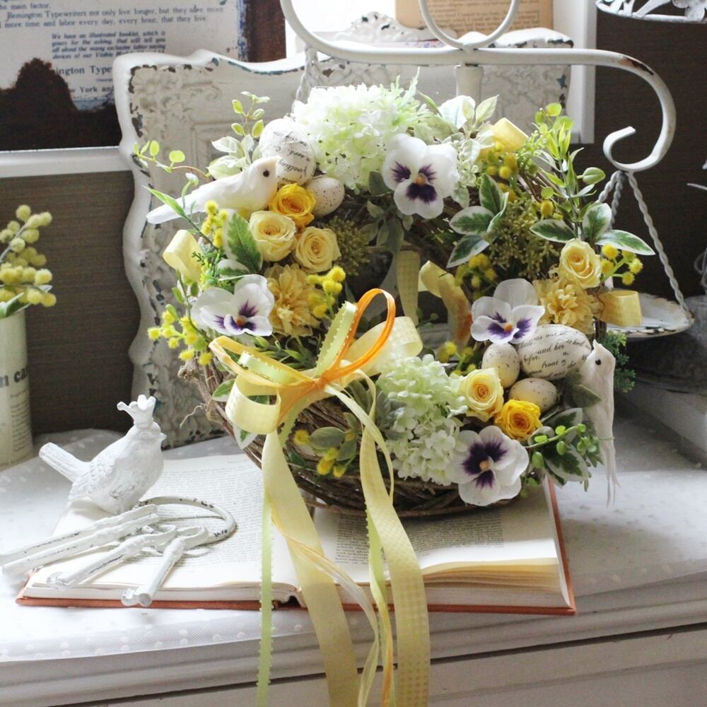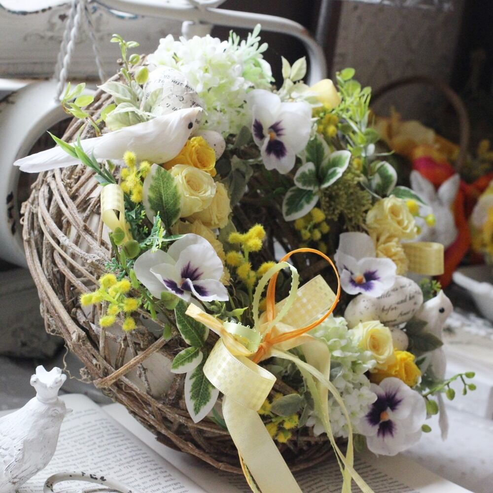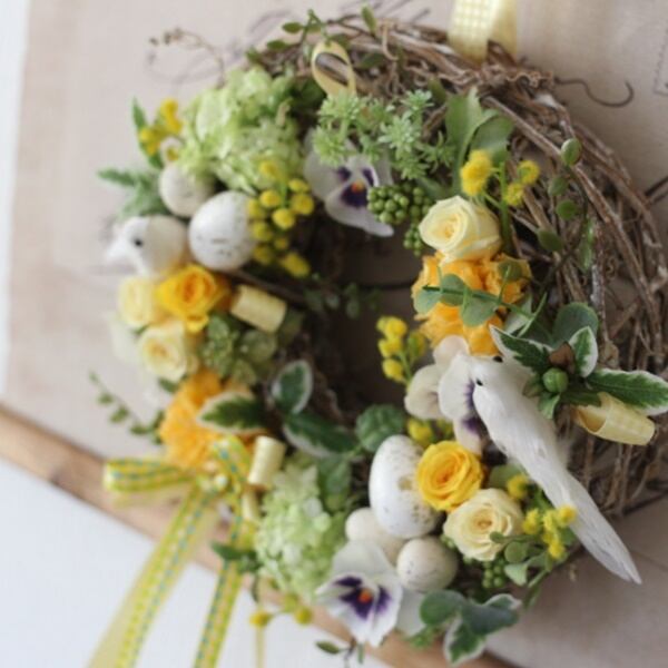 鳥かごをイメージしたリースに、小鳥やたまご、イエローのお花やグリーンをたっぷり使って、大きなリースを作成致しました。