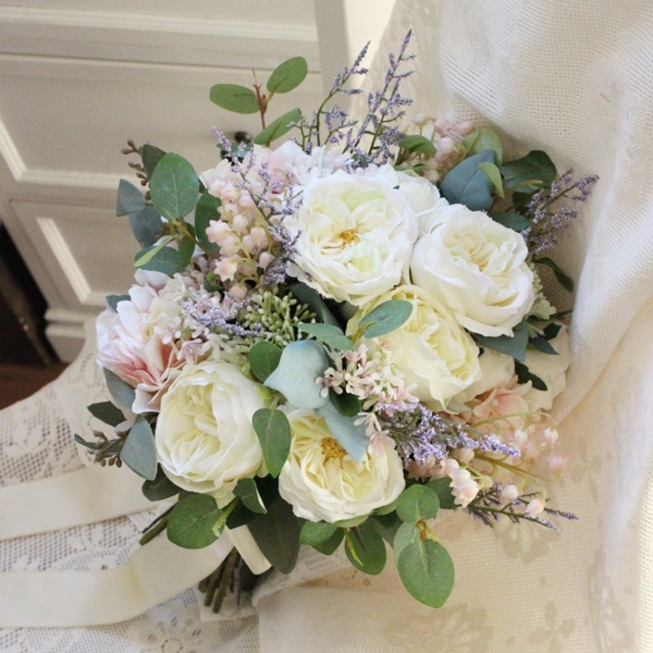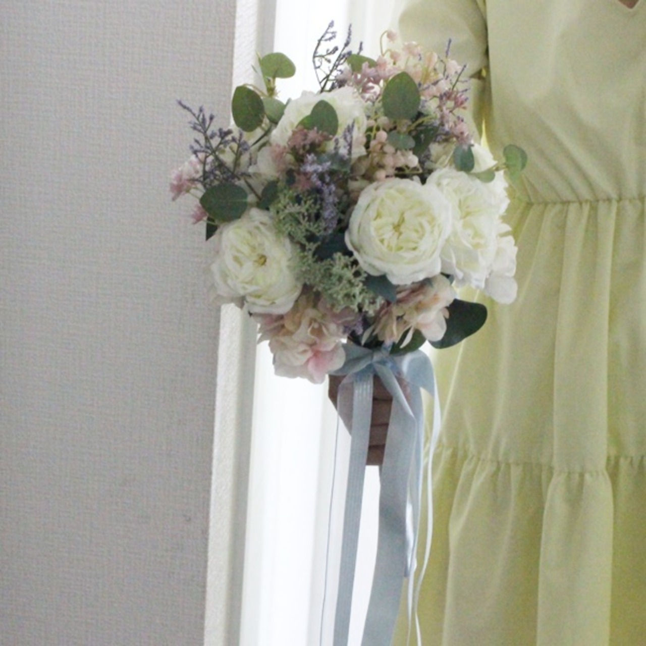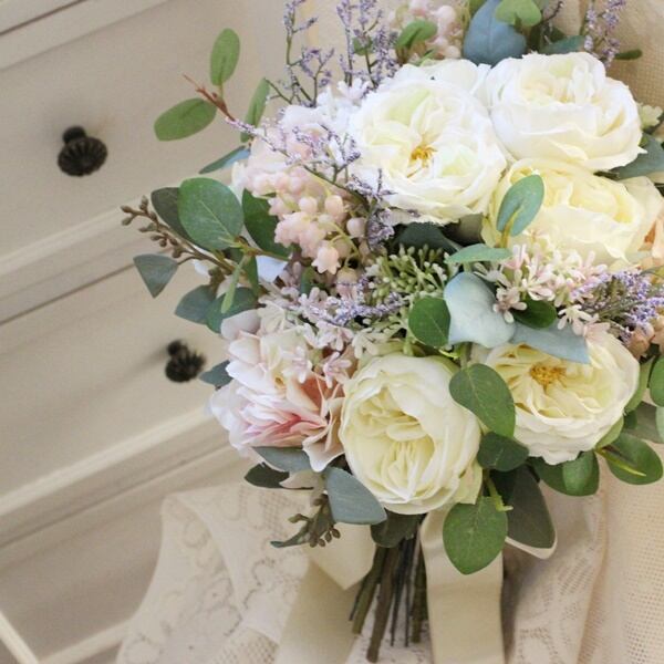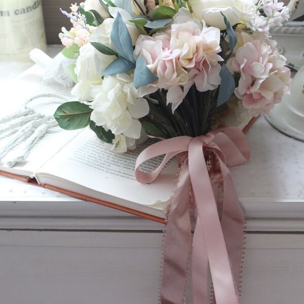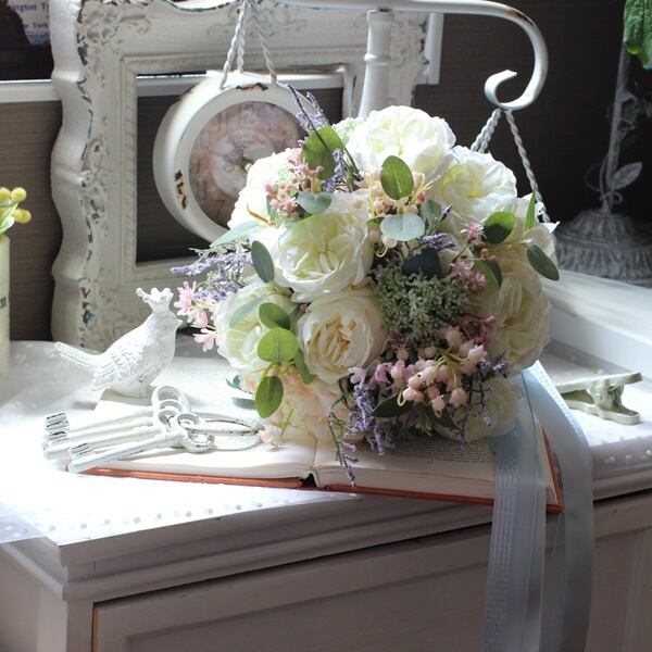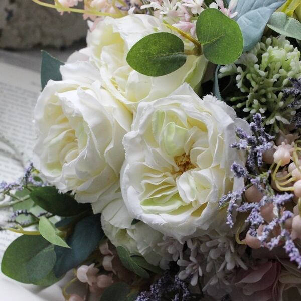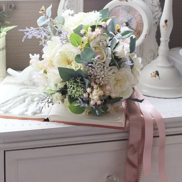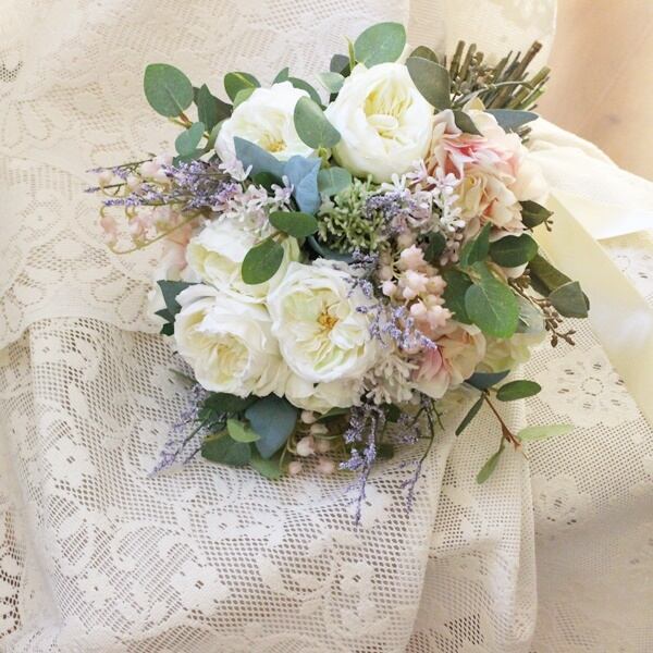 ■花材:ローズ数種・シキミア・スターチス・アジサイ・すずらん・スモールフラワー・ユーカリ・グリーン数種(アーティフィシャルフラワー)