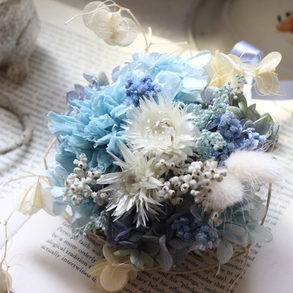 ◆花材:アジサイ2種・カーネーション・ソリダコ・ヤマイモのツル(プリザーブドフラワー) ハニーテール・サゴ・シルバーデージー・クリスパム(ドライフラワー)