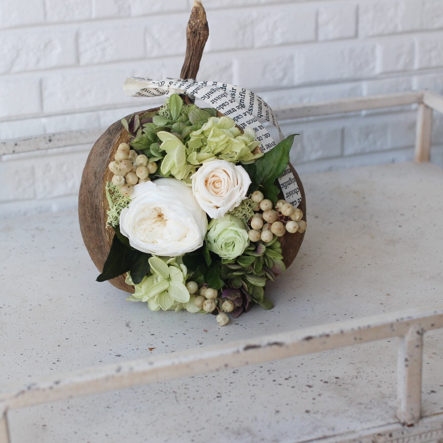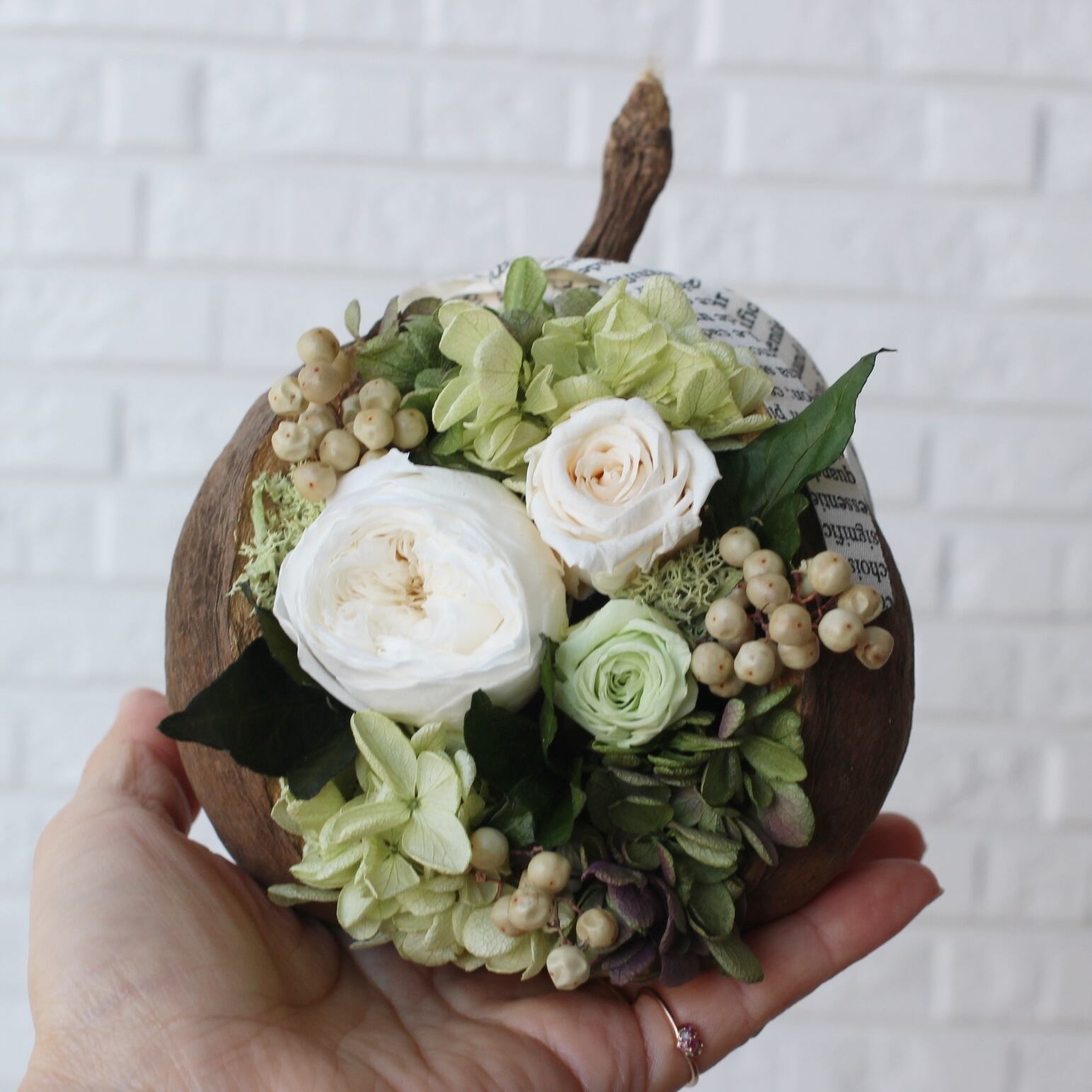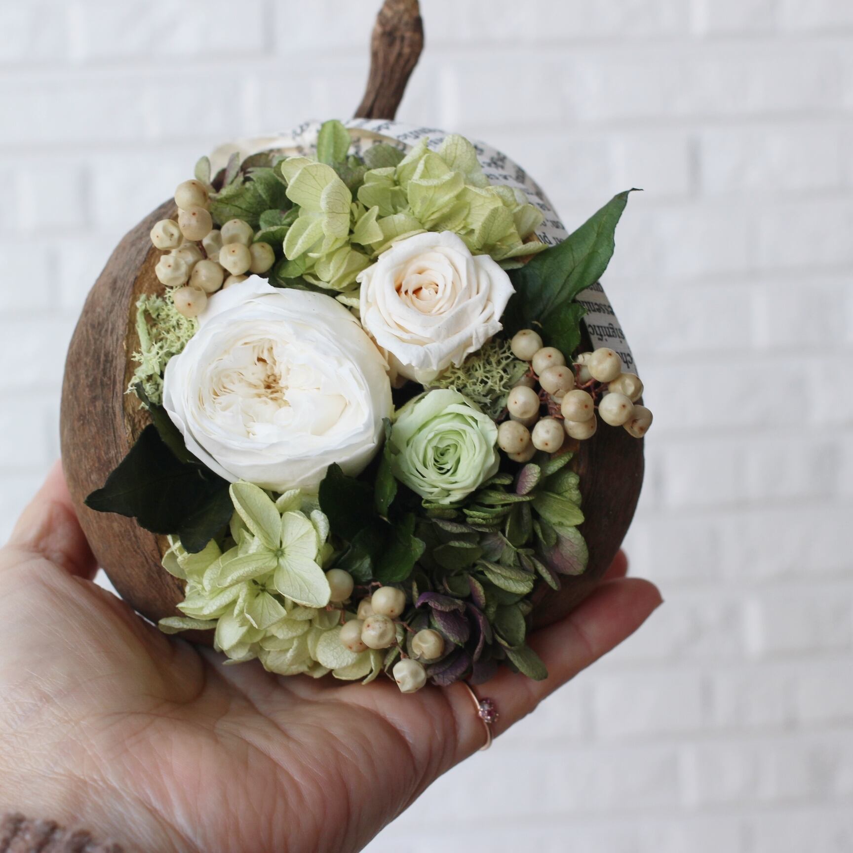 ブラウンのブッダナッツに、ローズなどのプリザーブドフラワーを入れて、ナチュラルにデザインしました♪