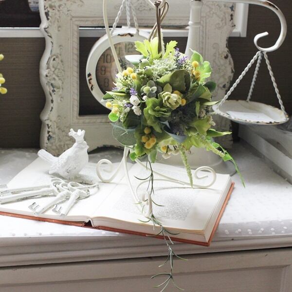 ◆花材:ミモザ・カスミソウ・ラベンダー・グリーンネックレス・グリーンベリー・ホワイトベリー・ミニファイカス・グリーンフラワーツィッグ・マーブルリーフ・プミラ・フォックステイル・フロックグリーンなど(アーティフィシャルフラワー)