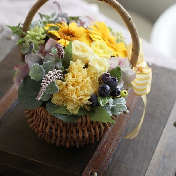■花材:ガーベラ・ミニローズ・カーネーション(プリザーブドフラワー) アジサイ・ブルーベリー・セダムベリー・ユーカリ・ミント(アーティフィシャルフラワー)