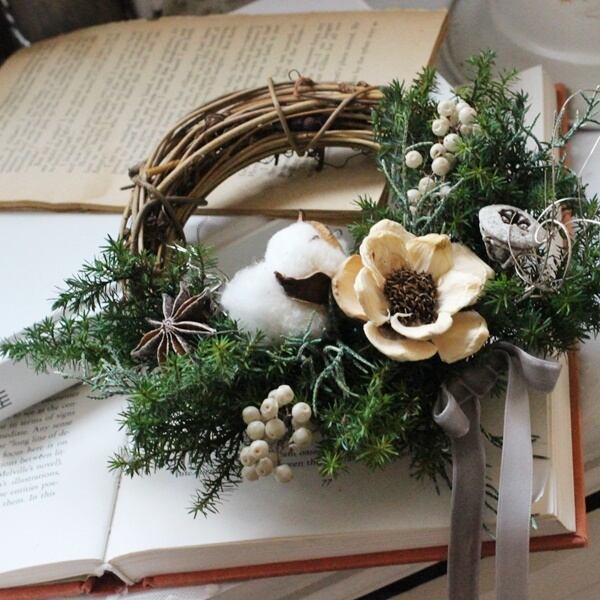 スギをベースに、木の実やペッパーベリーなどを使ってナチュラルに仕上げております。