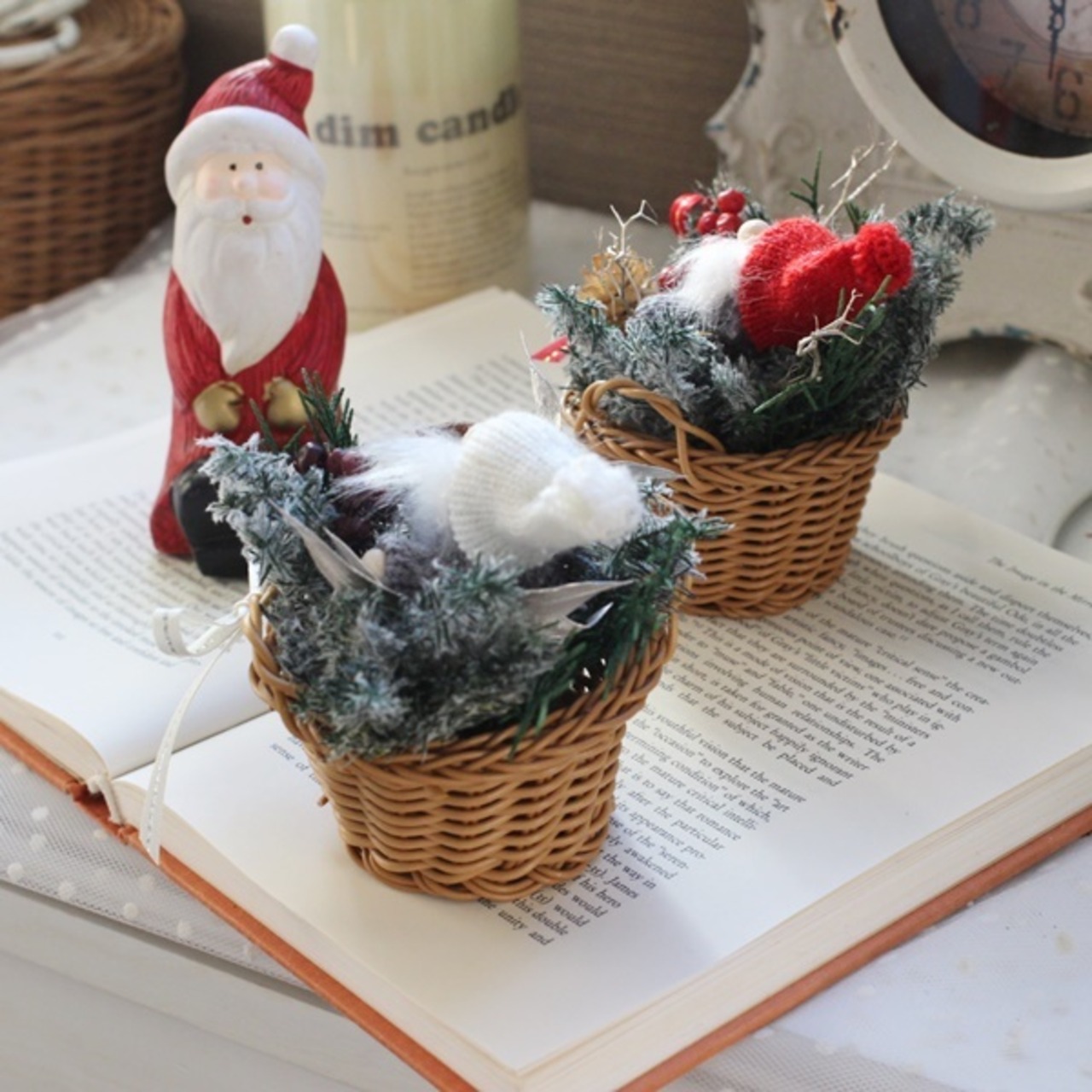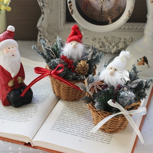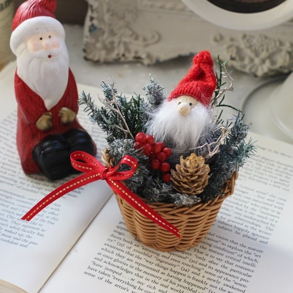 小さなバスケットに、サンタとグリーンや木の実などを飾り付けました。