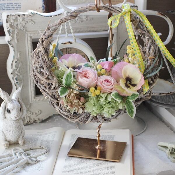 ■花材:パンジー・ミモザ・ファイカス(アーティフィシャルフラワー) ローズ・ユーカリ・アジサイ(プリザーブドフラワー)