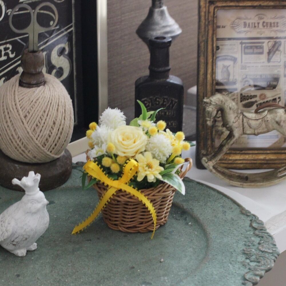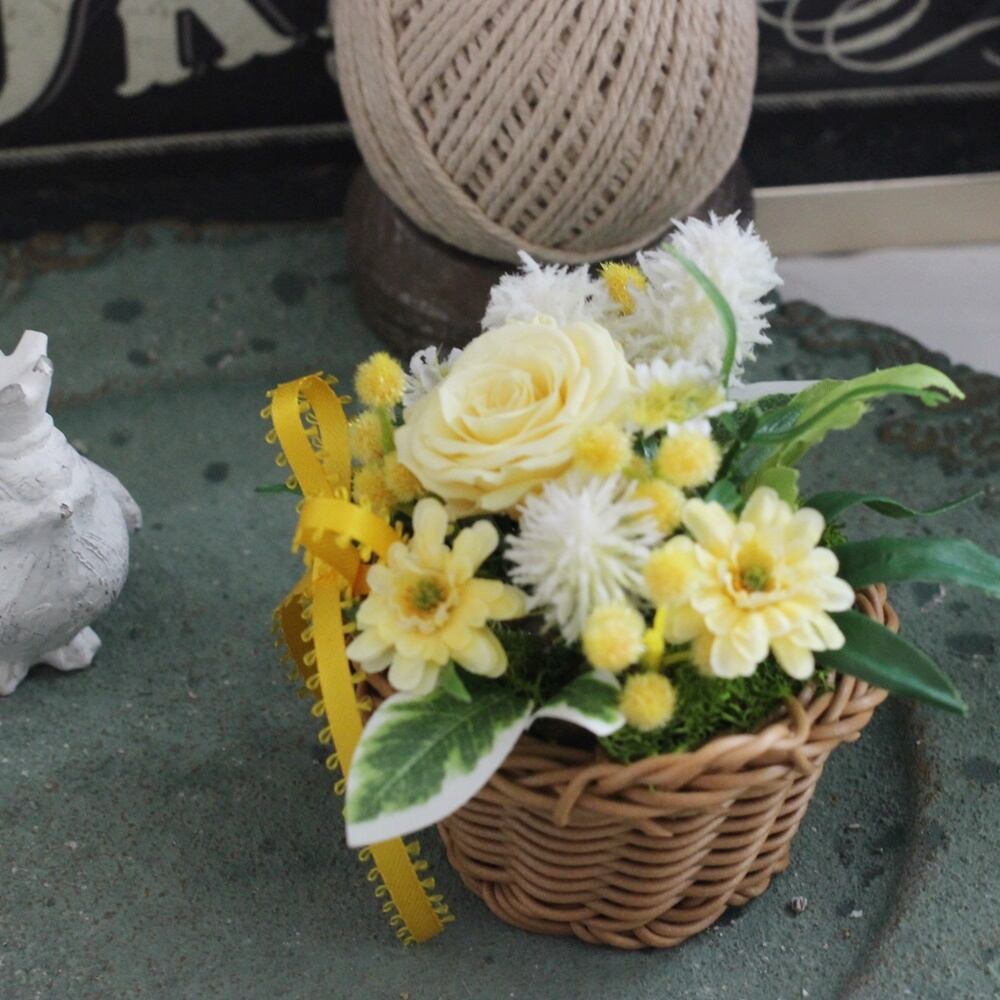 小さなバスケットに、イエローやホワイトの花を飾り付けました。
