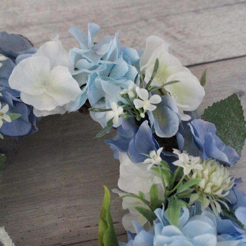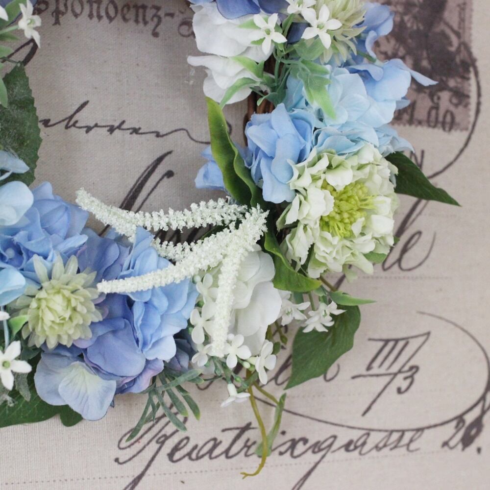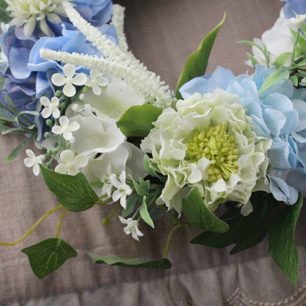 数種類のアジサイと、グリーンのスカビオサ、ホワイトの小花グリーンを入れてナチュラルに仕上げたリースです。