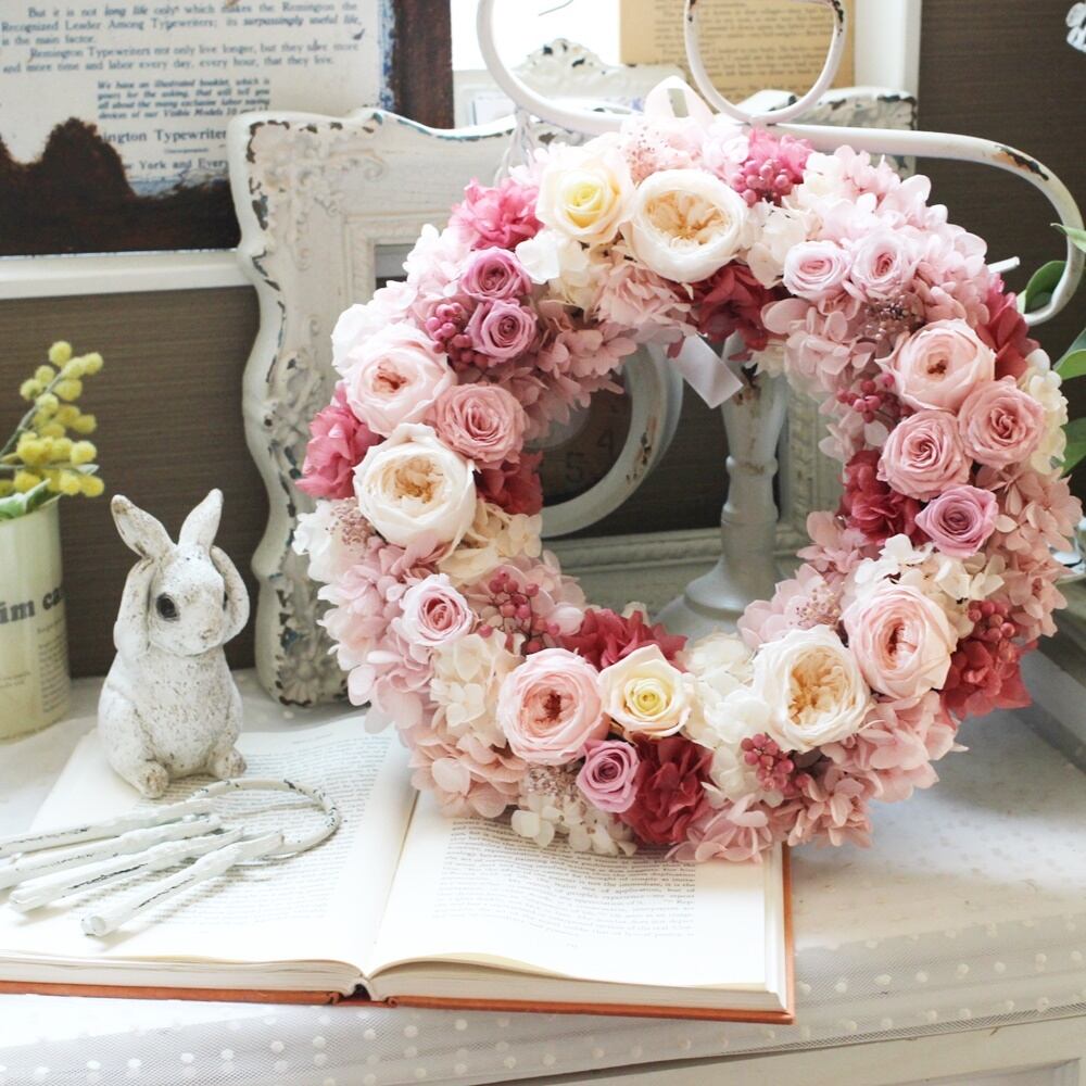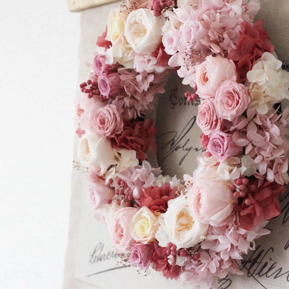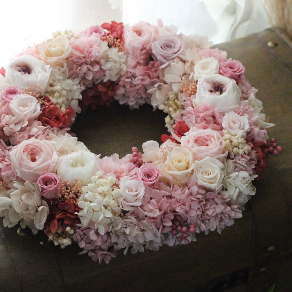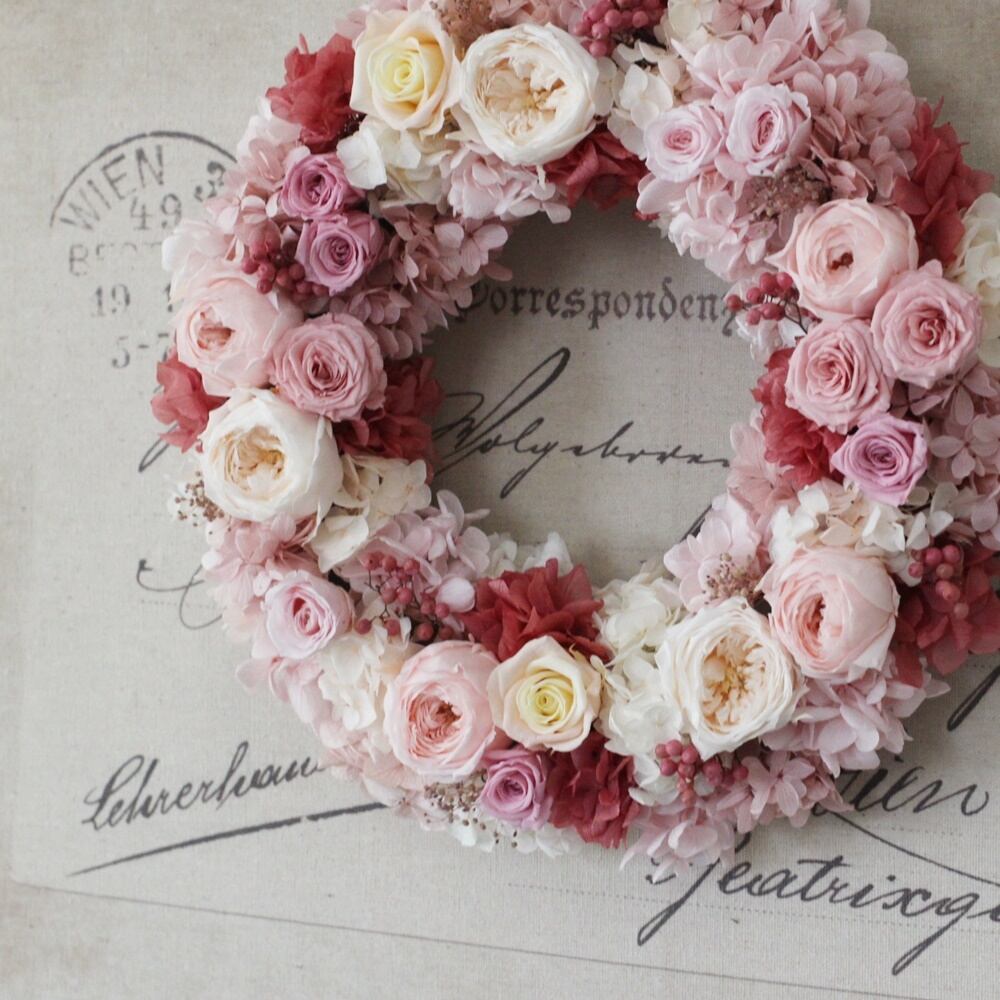 様々なピンクローズを入れたリースをご用意致しました!