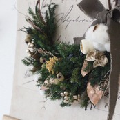 ■花材:スギ・マウンテンジュニパー・ヴェスペネスト(プリザーブドフラワー) サンキライの実・コットン・ゴールドリーフ・木の実数種(ドライ)