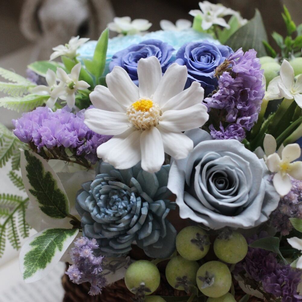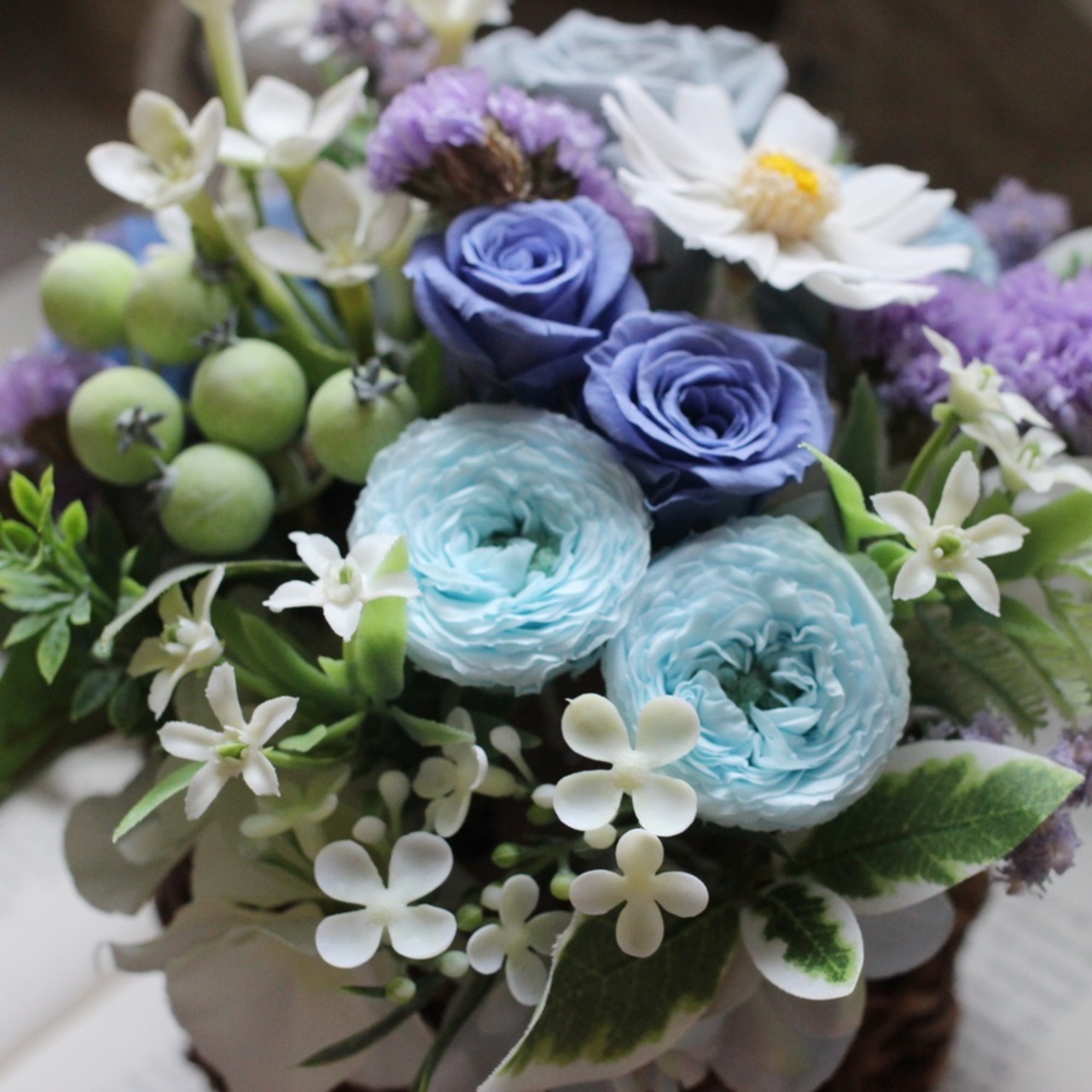 プリザーブドのジニアやブルーローズをメインに、ベリーや小花でナチュラルに飾り付けたアレンジです。