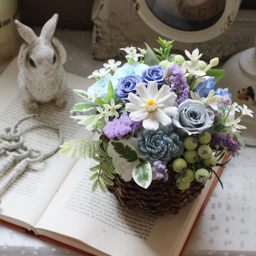 いくつか出しているバスケットアレンジですが、人気のカラー、ブルーとパープルのお花で制作致しました。