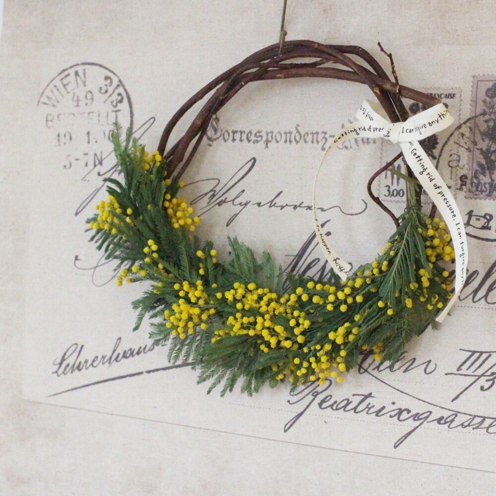 こちらのリースは、アカツルにミモザを飾り付けたリースとなります。