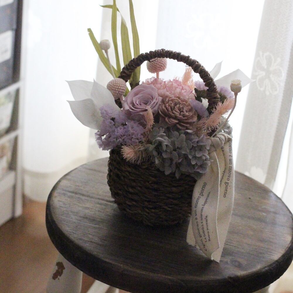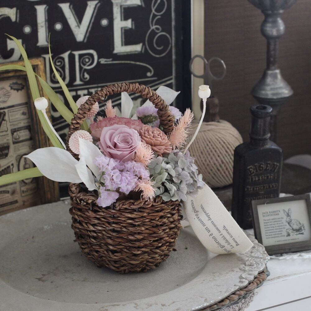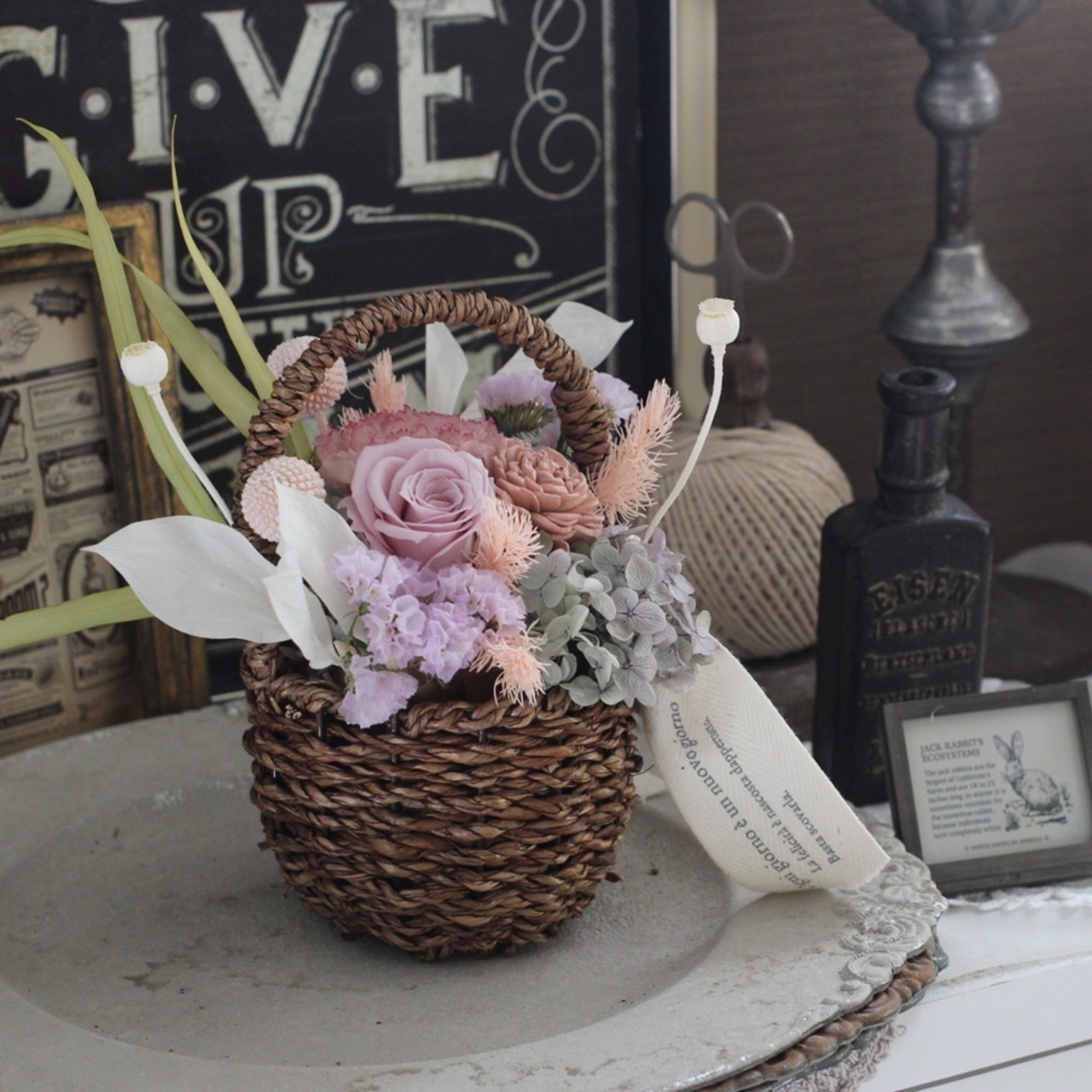 プリザーブドのローズ、カーネーション、ソーラーローズやドライフラワーなどを混ぜたナチュラルバスケットです。