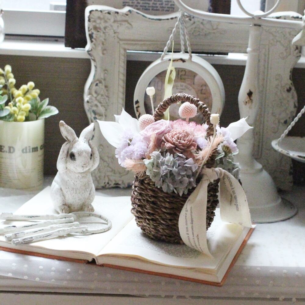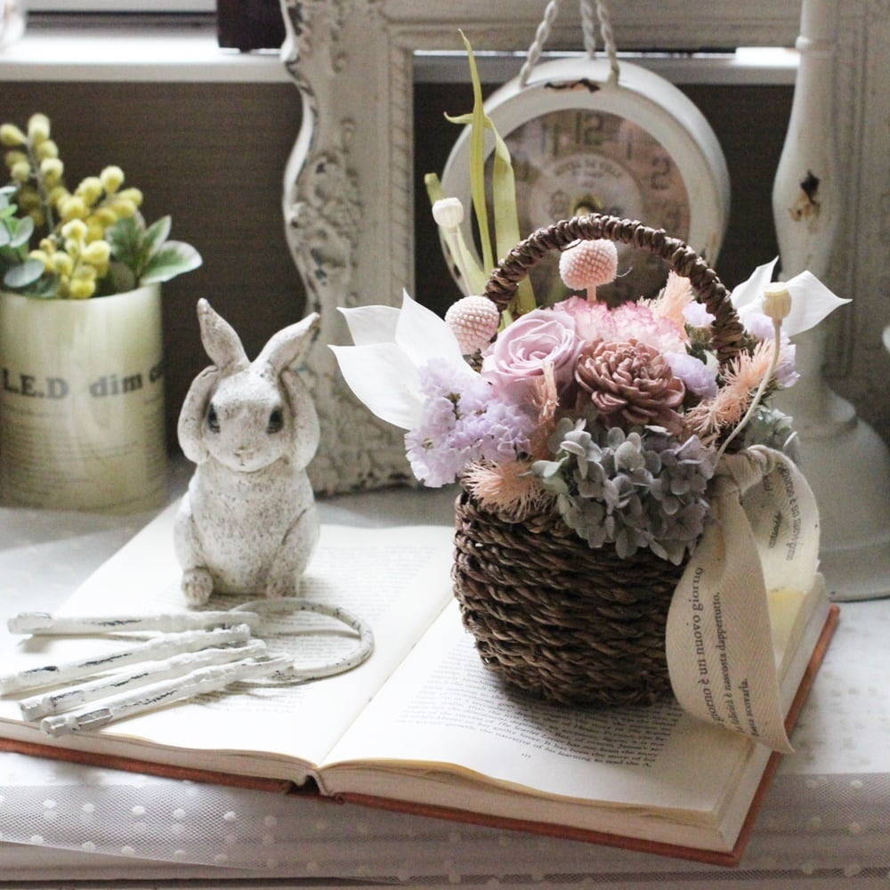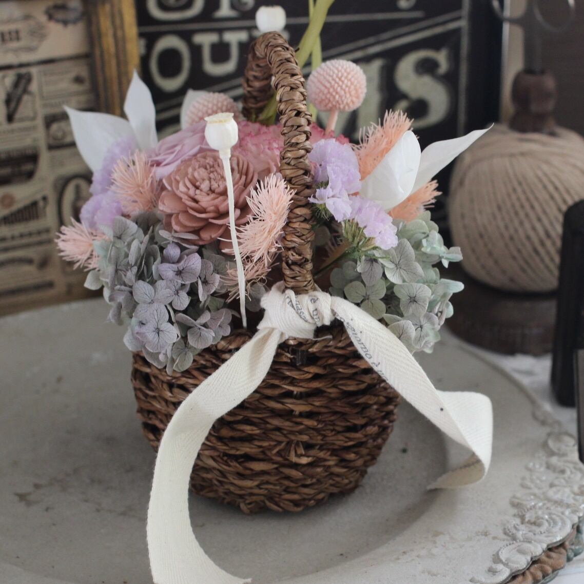 プリザーブドのローズ、カーネーション、ソーラーローズやドライフラワーなどを混ぜたナチュラルバスケットです。