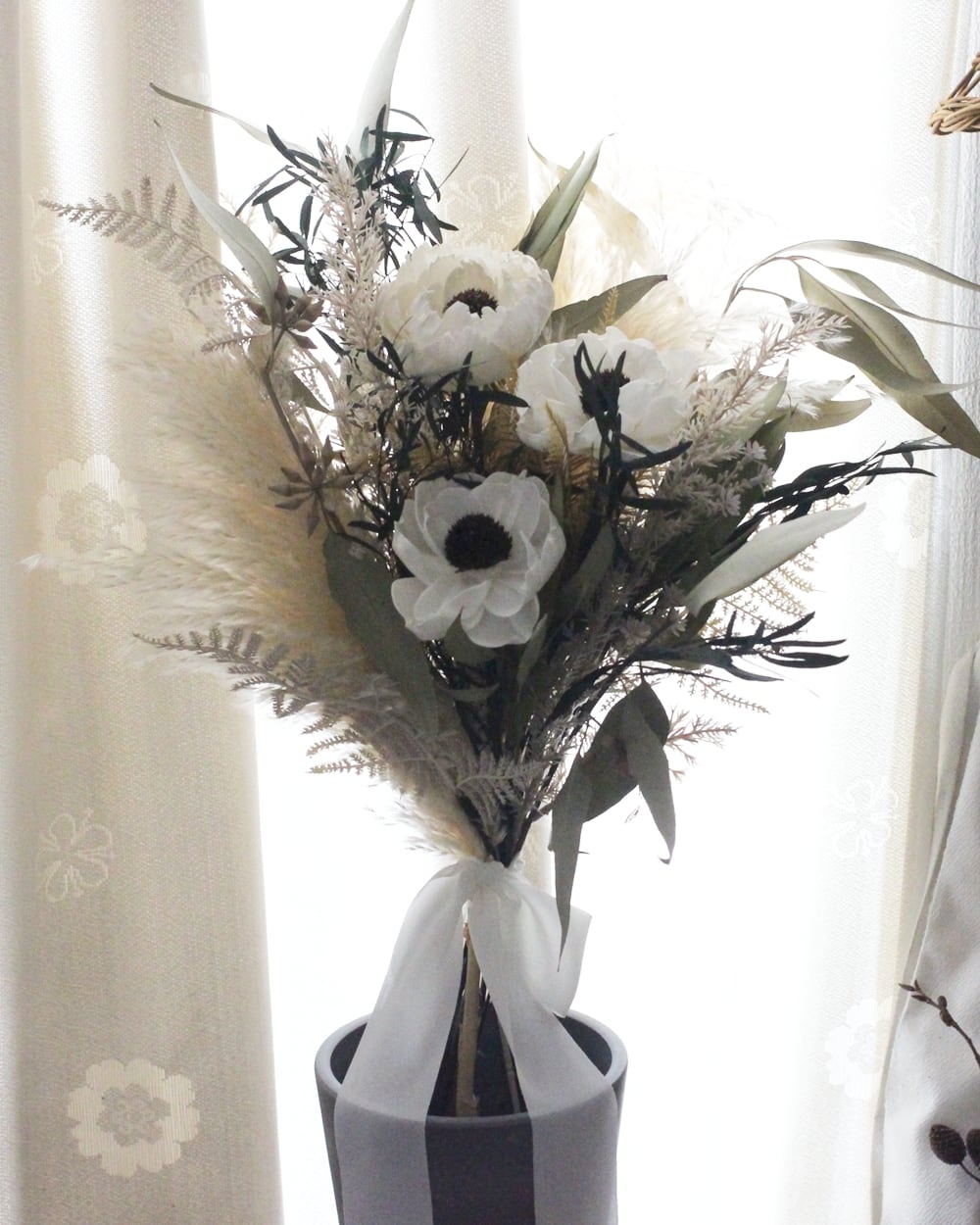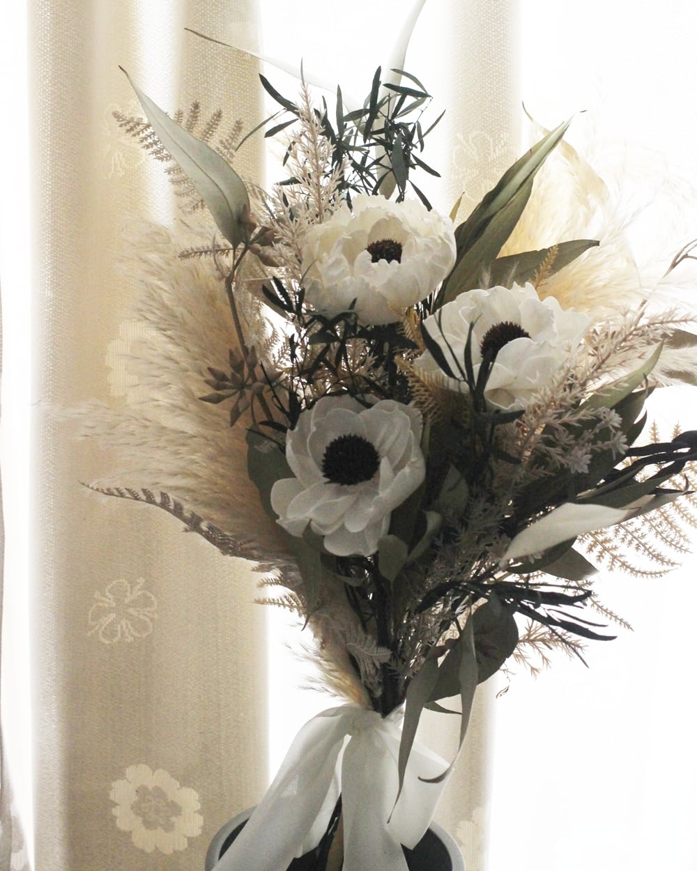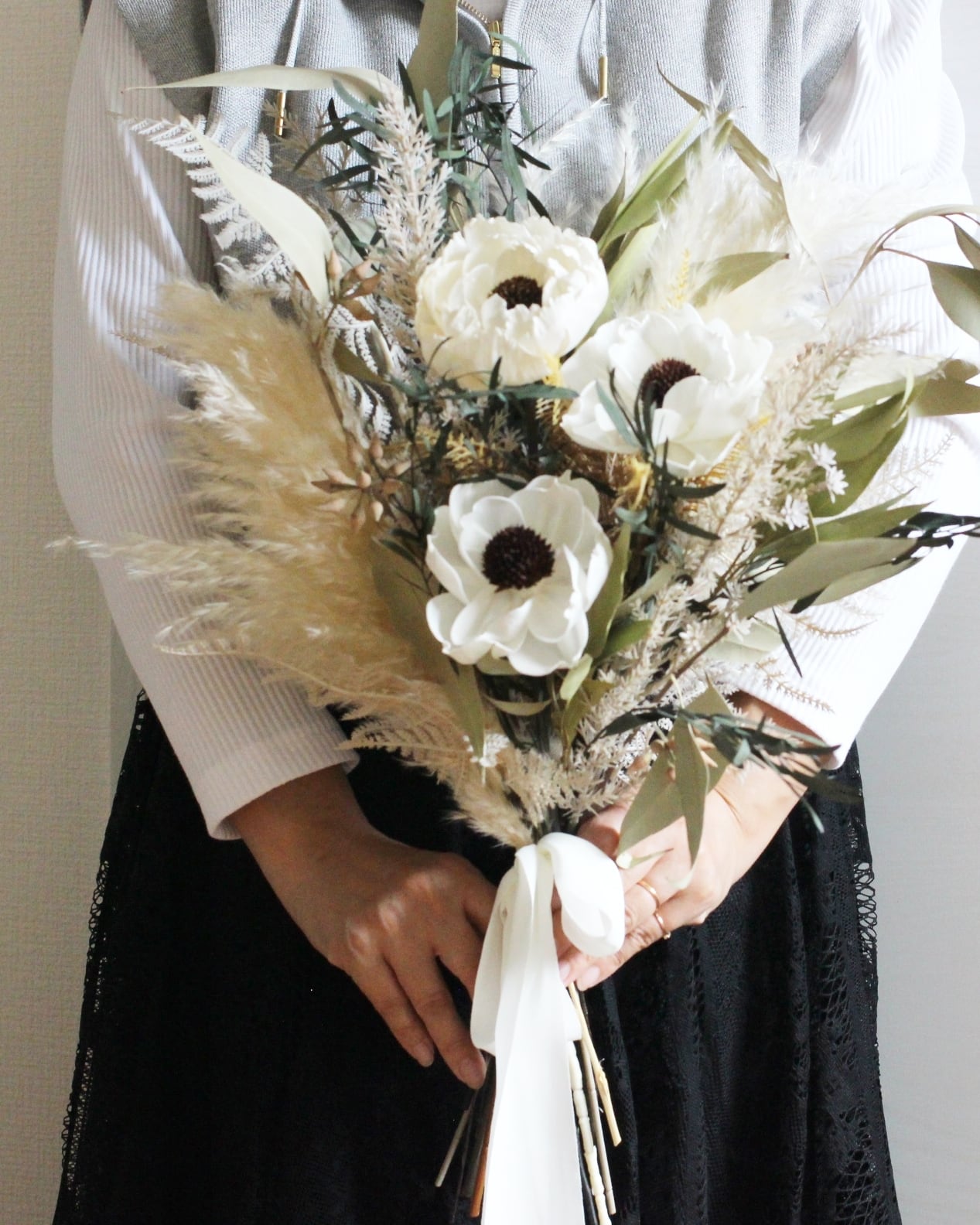 アーティフィシャルのアネモネ、ユーカリとパンパスはドライフラワーで制作しております。