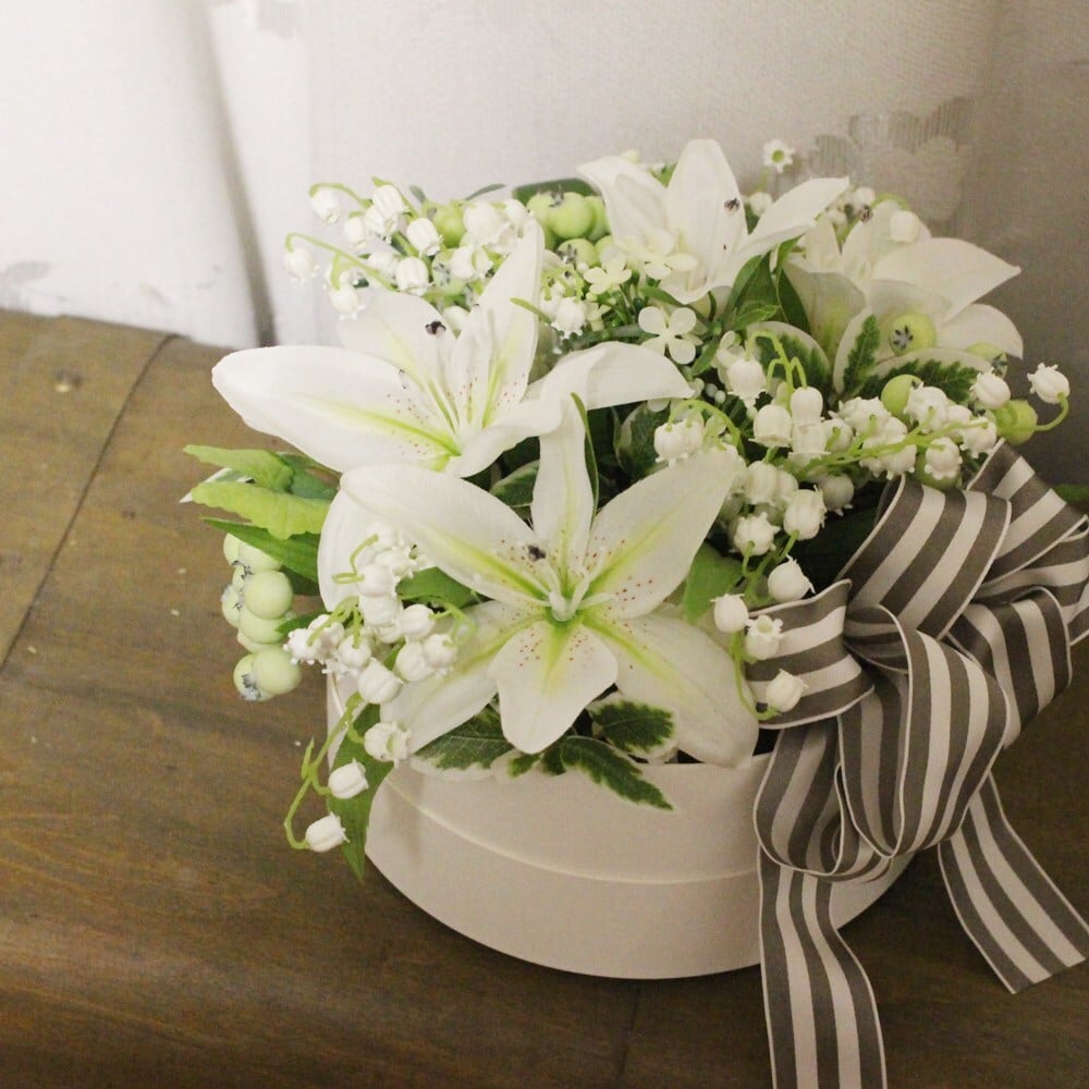 ホワイトのラウンドボックスに、ユリなど爽やかなホワイトグリーンのお花を詰め込んだアレンジ。