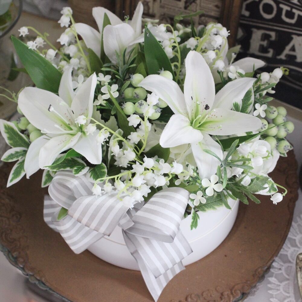 ◆花材:ユリ・すずらん・ベリー・小花・ファイカスなどグリーン数種(アーティフィシャルフラワー)