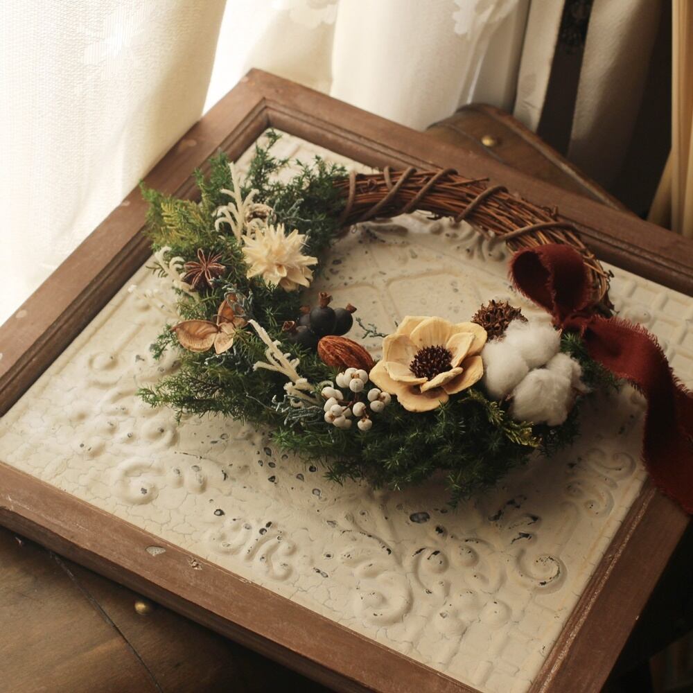 ■花材:スギ・ブルーアイス・ヒバ・ロングタチカズラ(プリザーブドフラワー) パインフラワー・コットン・ブラックベリー・ナンキンハゼ・木の実数種(ドライ)