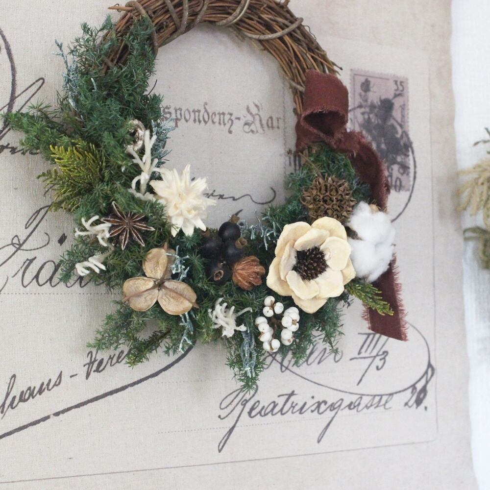 パインフラワーのアネモネとコットンをメインに、可愛いハーフリースをご用意致しました。