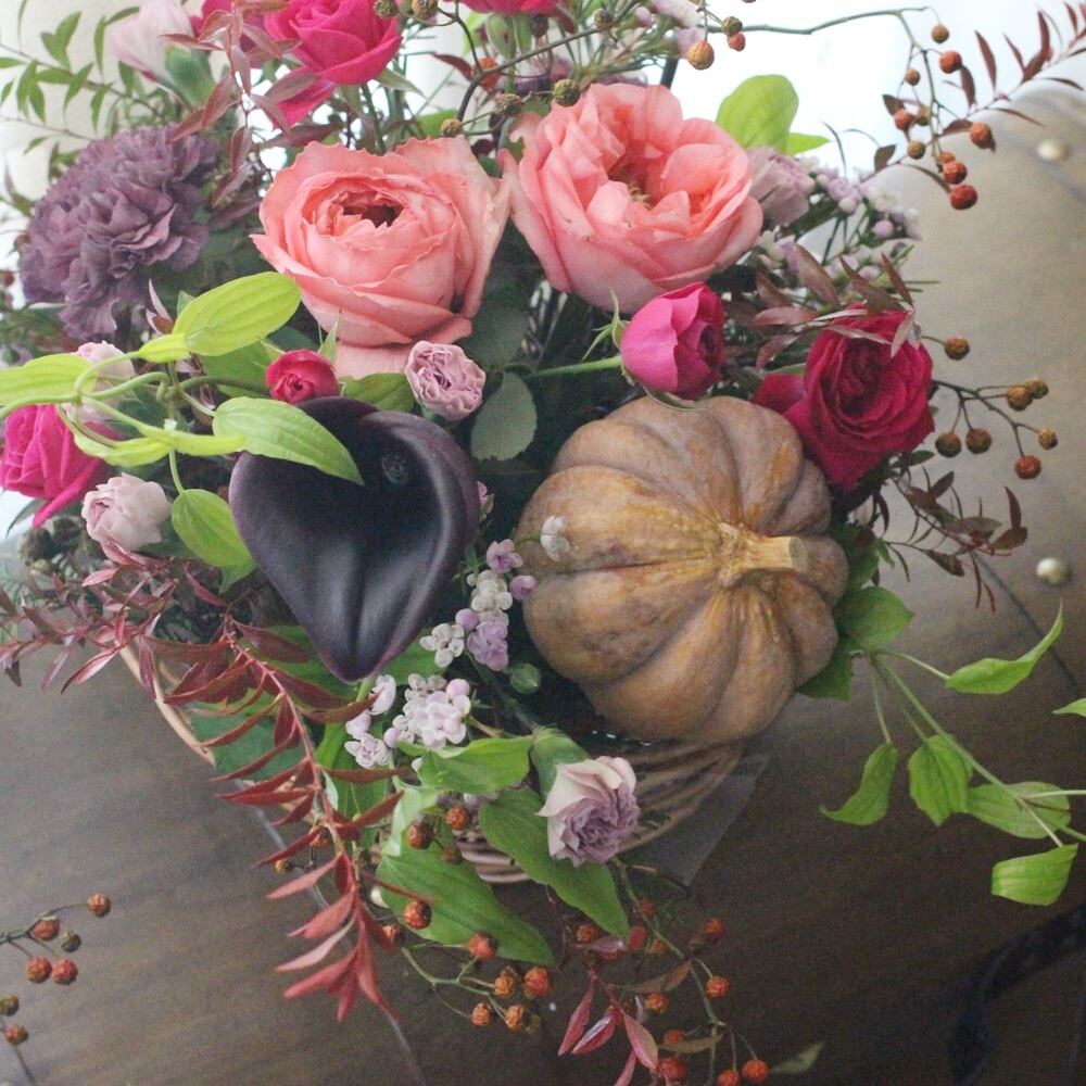◆花材:かぼちゃ・ローズ・グリーン・季節のお花を使用