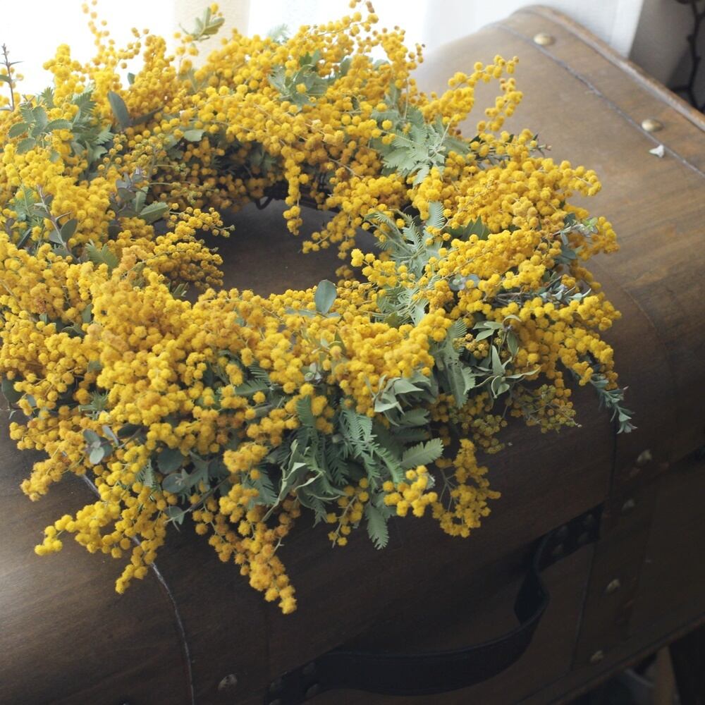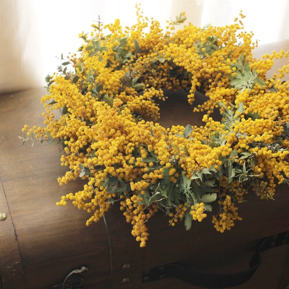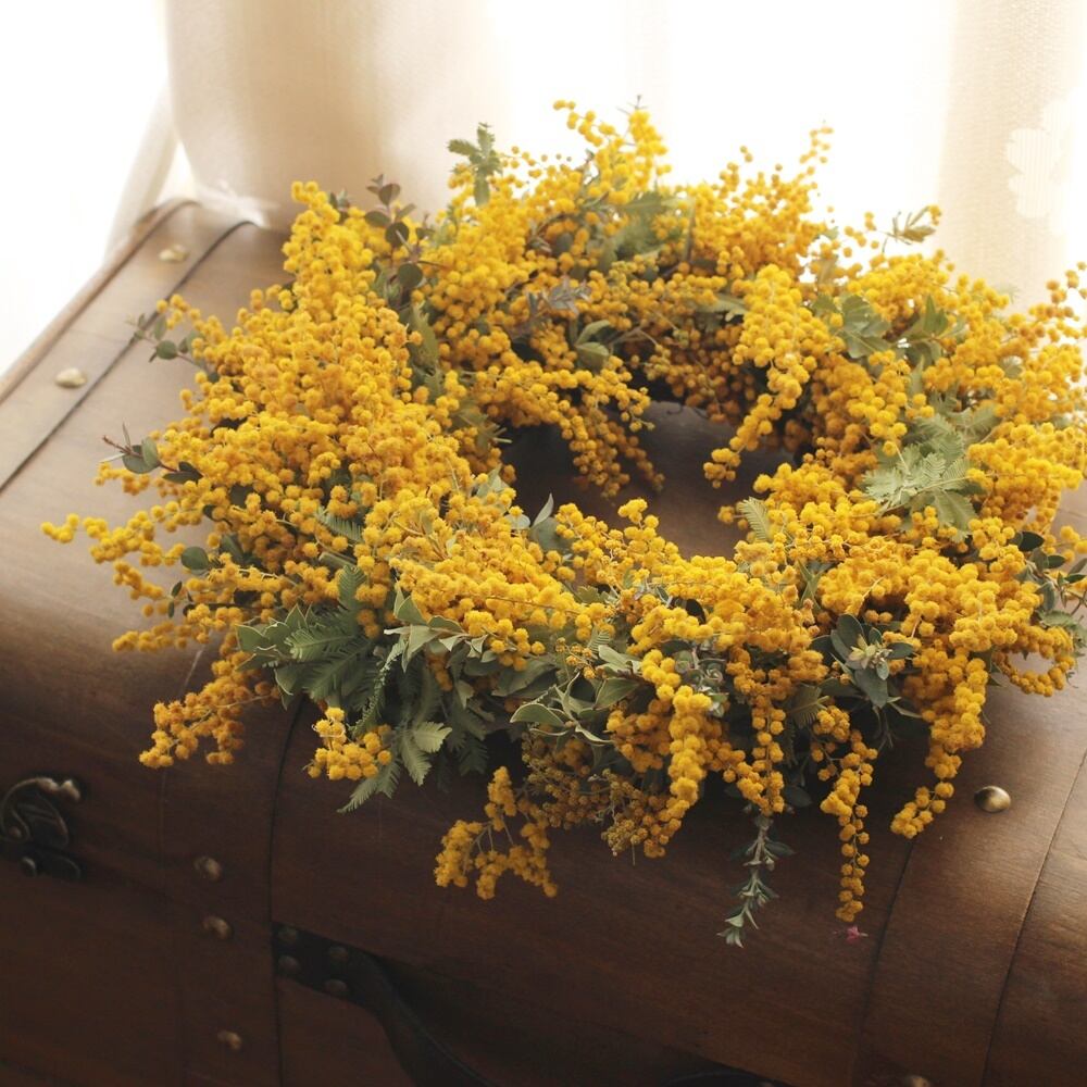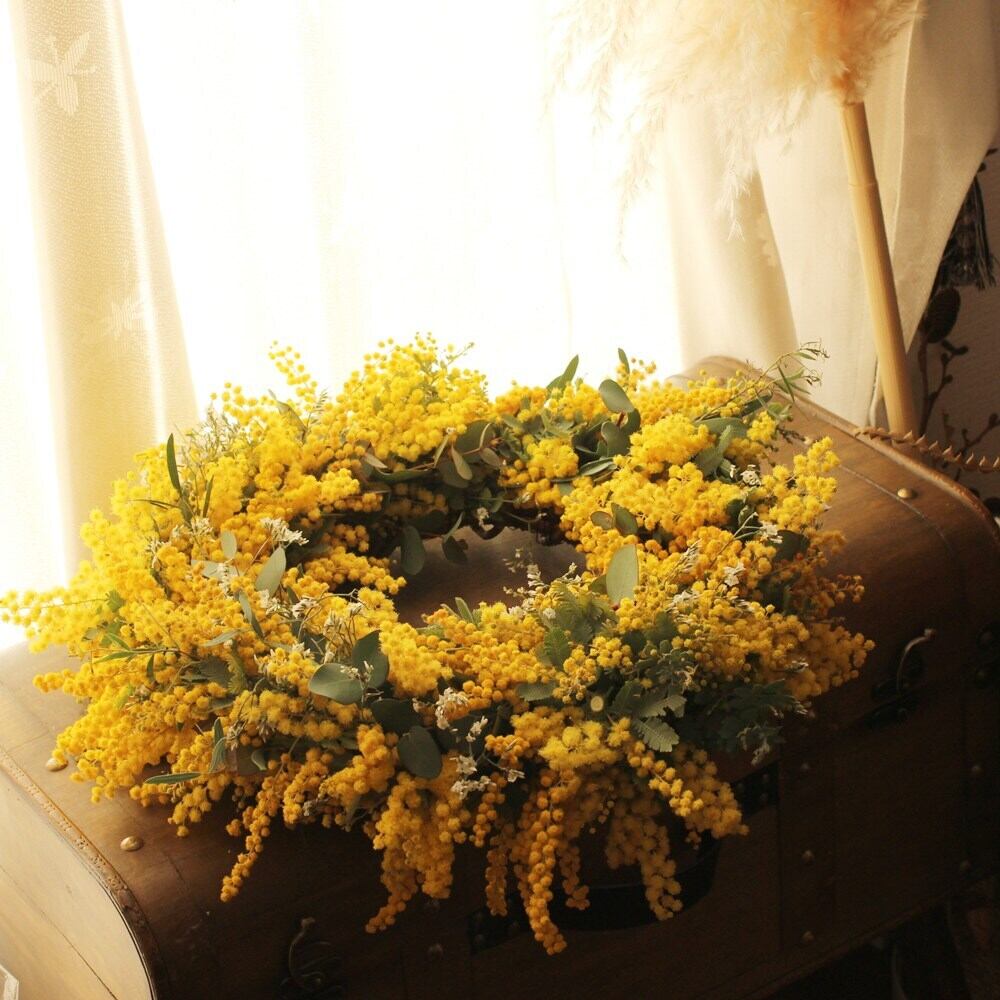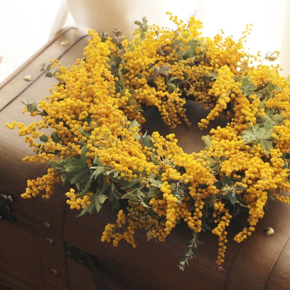 写真のミモザは綺麗なイエローとなりますが、ご購入の時期によっては少しくすむ場合がございます。